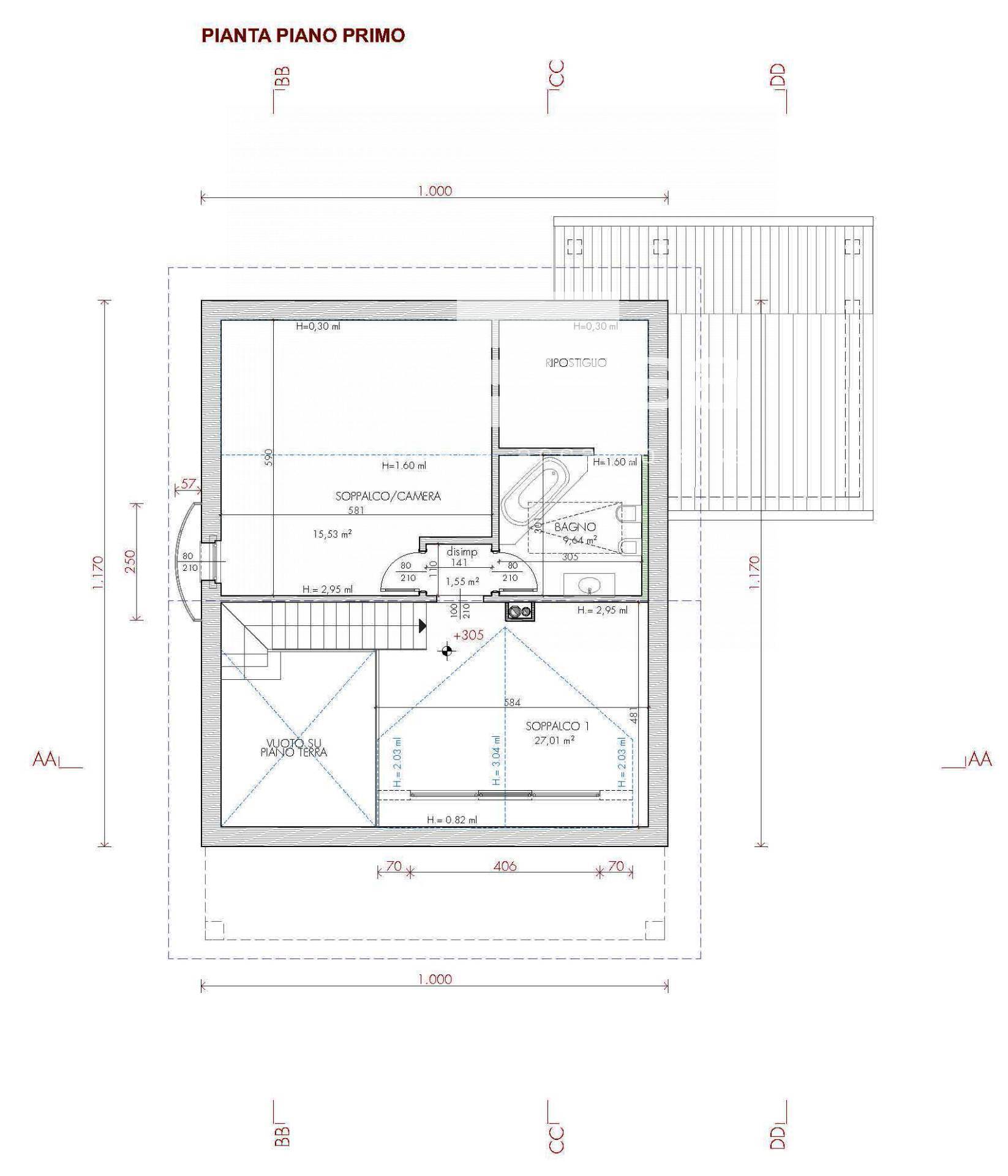 La soluzione proposta prevede al piano terra zona giorno open-space di quasi 45 mq, due camere, due bagni, lavanderia e rispostiglio, al piano primo terza camera, terzo bagno ed ampio soppalco.
