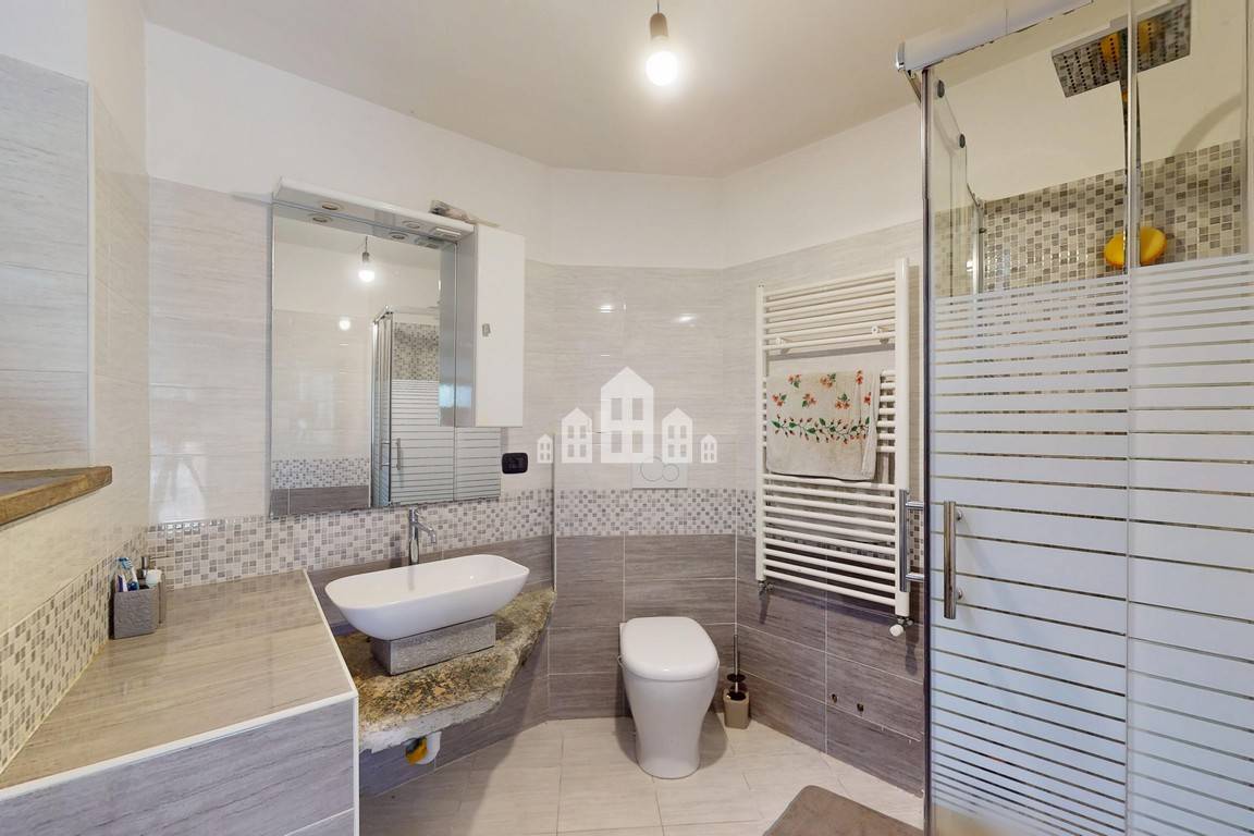 La zona giorno al piano terreno luminosa e accogliente, completa di bagno, mentre al piano superiore si trova la camera da letto con il secondo bagno, ideale per privacy e comfort.