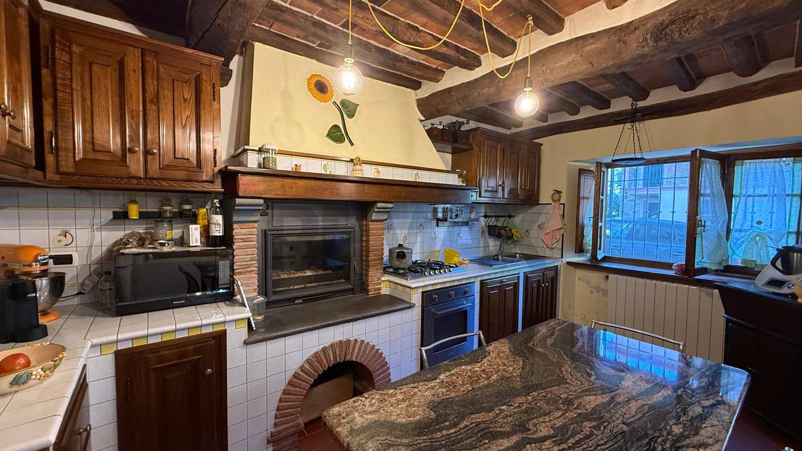 Calde travi e travicelli a vista con solai in mattoni, altro "fil rouge" di tutta l'abitazione insieme ai pavimenti in cotto, non mancano nella zona dedicata alla cucina: ambiente che sorprende per la raffinatezza dei suoi arredi fatti su misura in legno muratura.