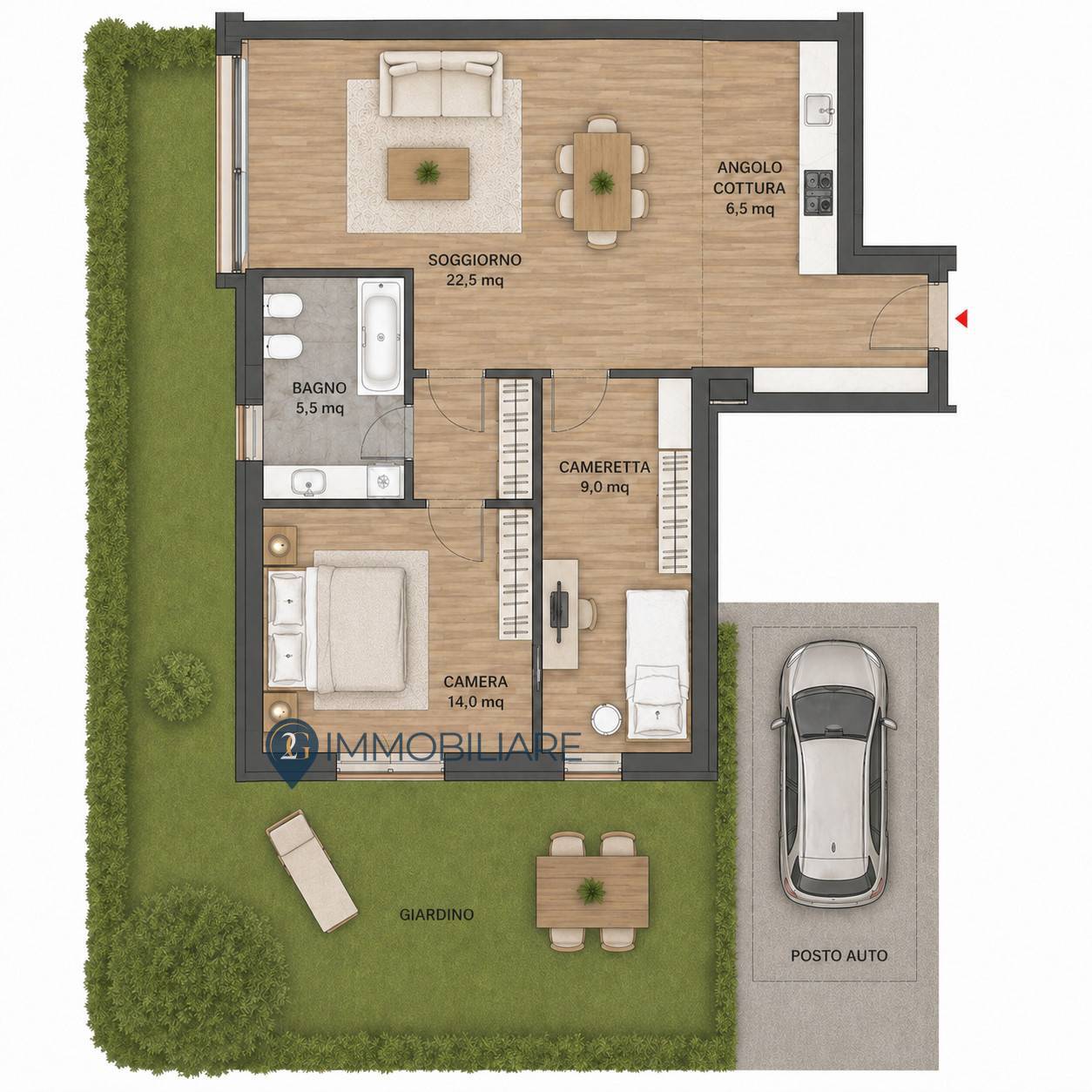 Composizione: ingresso in soggiorno con angolo cottura, camera matrimoniale, cameretta e bagno.