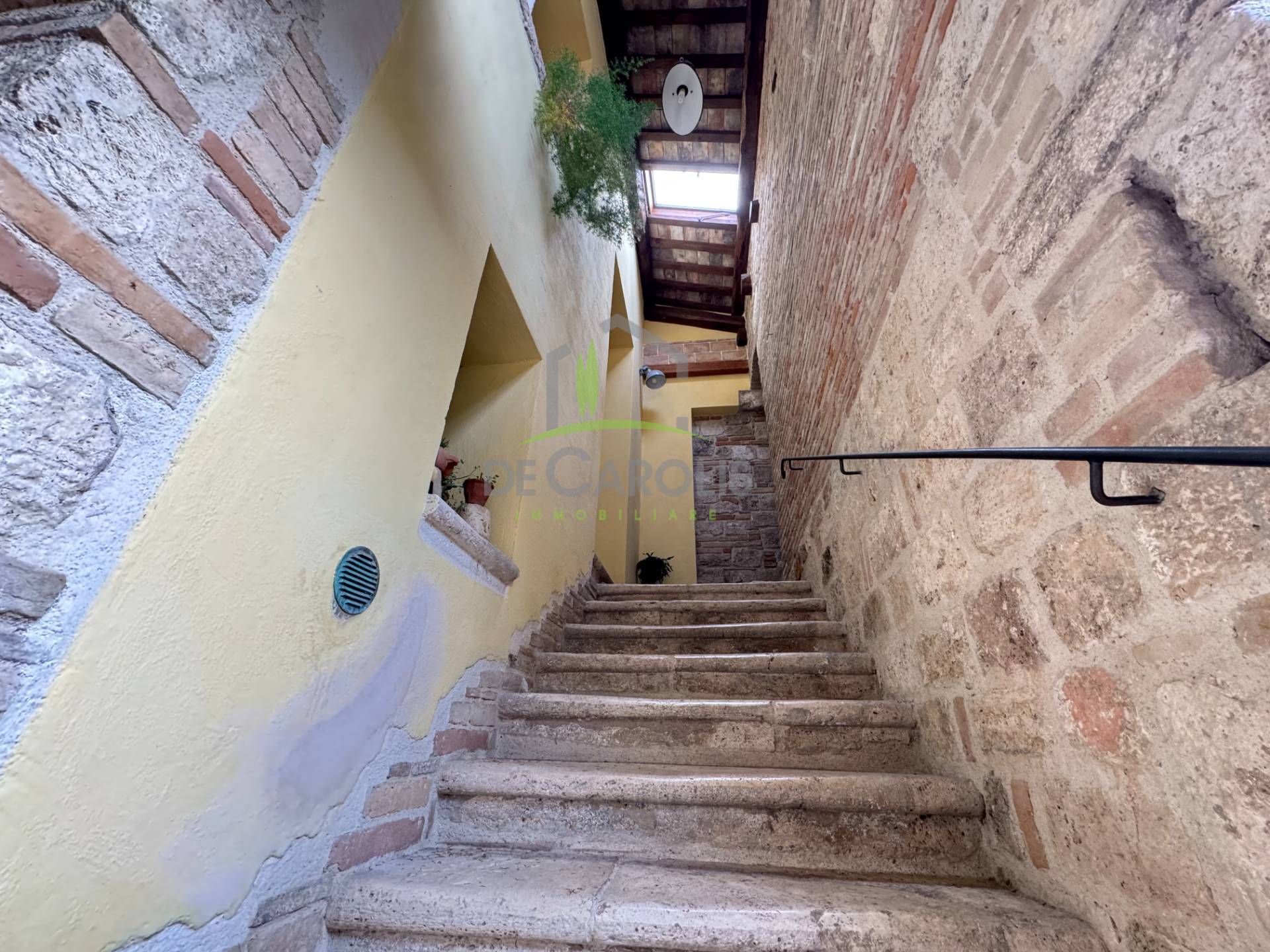 La propriet oggetto di vendita cos sviluppata, attraverso un androne splendidamente restaurato, si accede ad una scala esterna coperta in travertino ed arriviamo al piano primo e qui si apre uno splendido scenario, ampia zona giorno, salone d'ingresso servito da balcone con affaccio sulla corte, sala da pranzo, bagno di servizio, cucina abitabile con dispensa, da sottolineare gli splendidi archi in travertino ed il soffitto a vista con travi e pianelle.