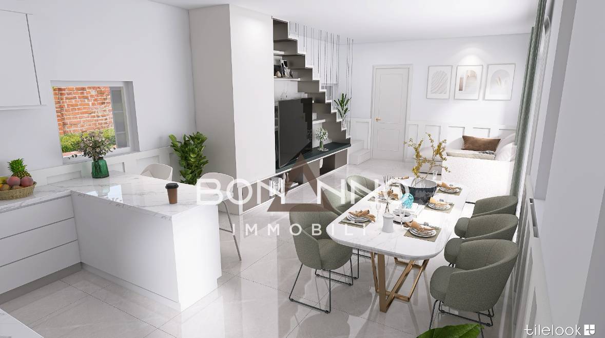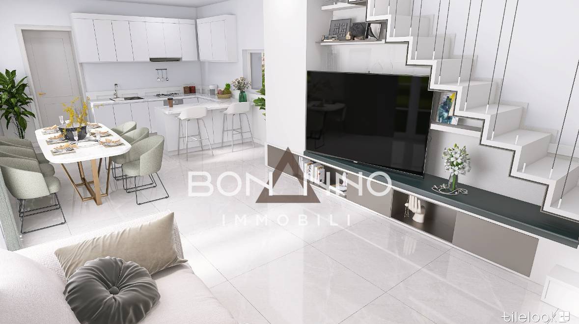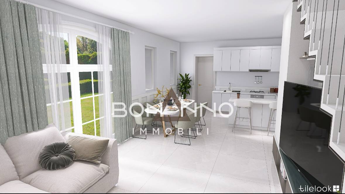 L'Immobile si sviluppa su due livelli: Ampio soggiorno/ cucina open space di oltre 38 mq con vetrata comunicante con il portico che costituisce a tutti gli effetti unestensione naturale della zona giorno.