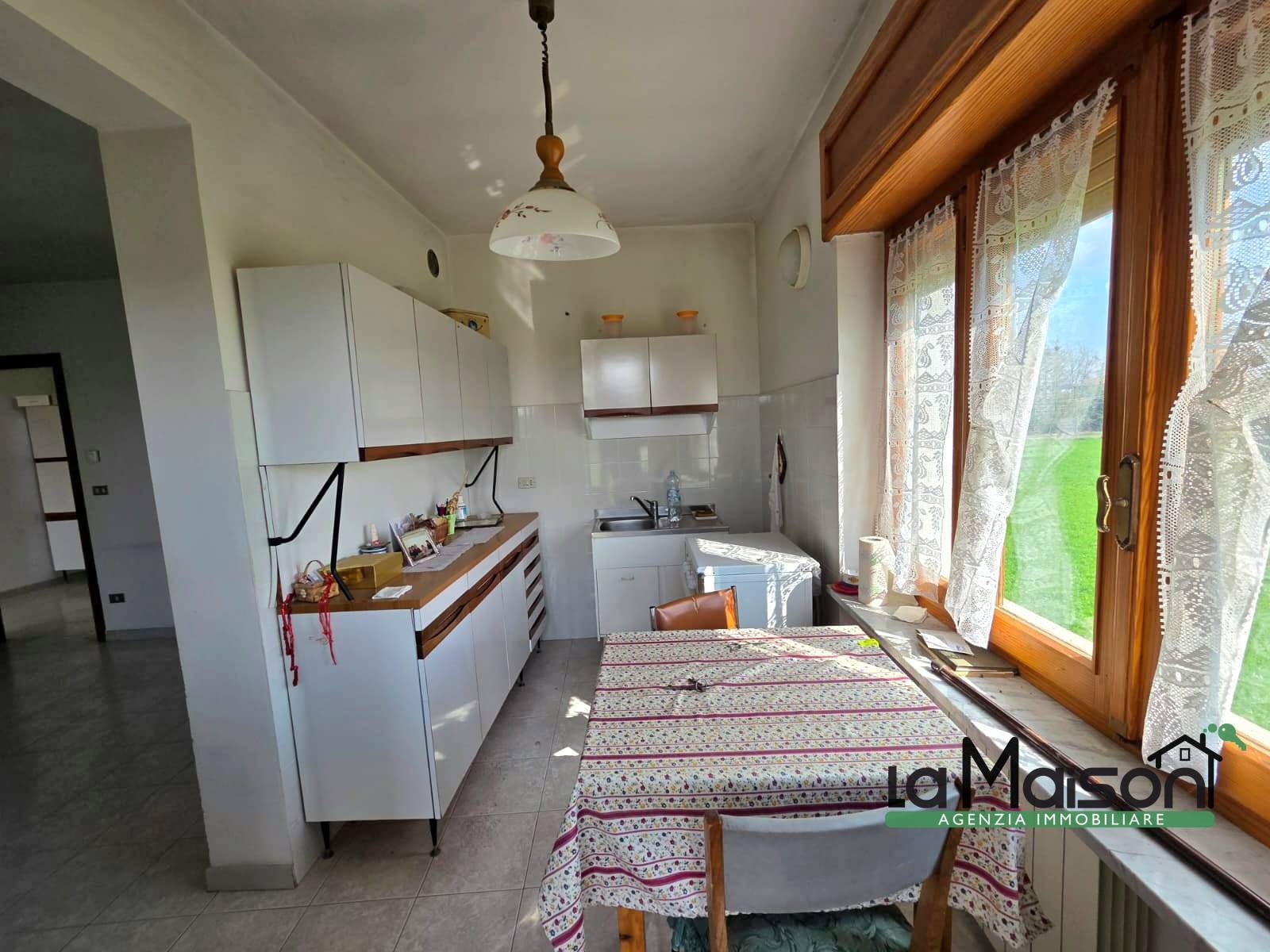Al piano terra della stessa unit si sviluppa unaltra zona giorno con tinello, cucina e soggiorno, oltre ad una suggestiva cantina con antiche volte in mattoni, che conserva tutto il fascino e lautenticit dei cascinali piemontesi.