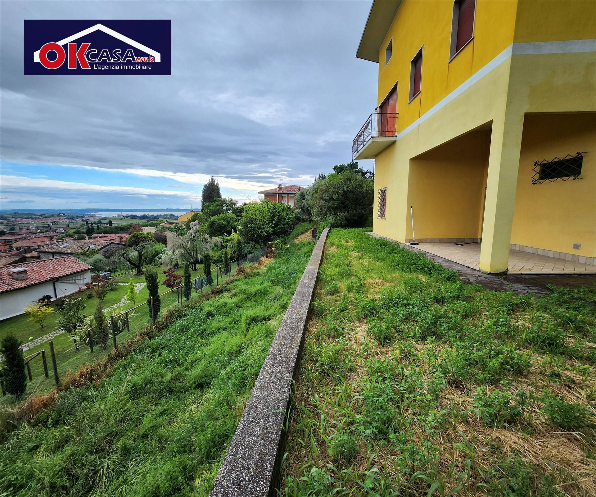 L'immobile, dalla grandezza di 250 mq circa, disposto su 3 piani: Piano rialzato: 1 bagno e 3 locali, di cui un salotto con terrazzo su due lati con vista magnifica sul lago Interrato: 3 locali, 1 bagno e ampio garage magazzino adiancente adatto per oltre 4 auto. Sottotetto: Ampio e luminoso locale Giardino piantumato in parte ad ulivi giardino di 1100 mq circa.