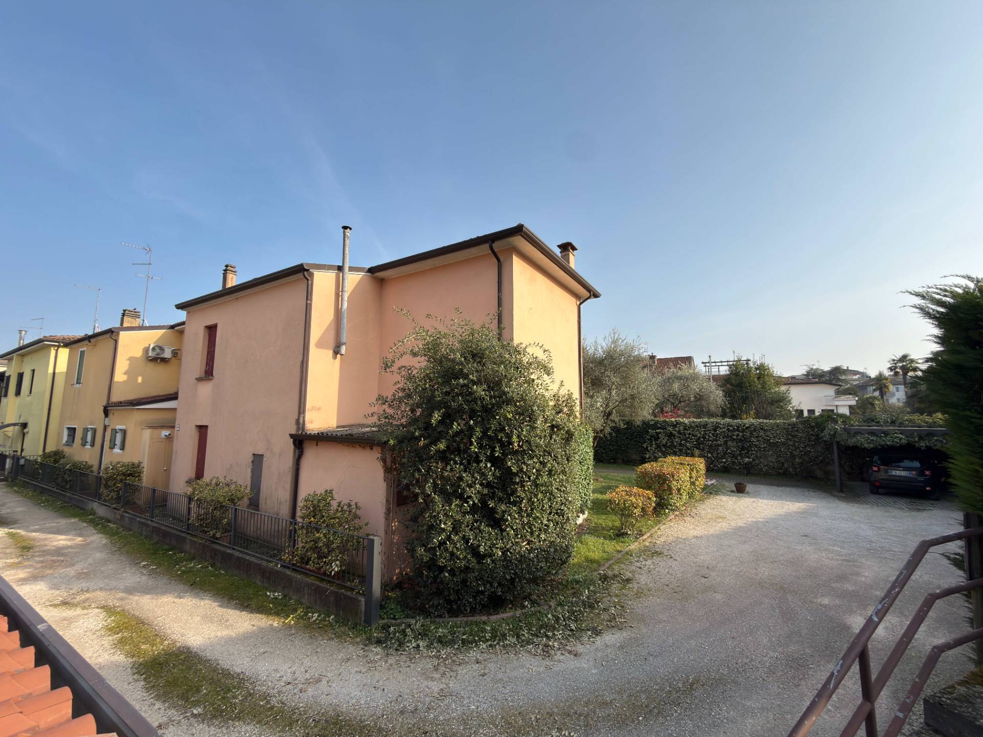 Presenta un giardino di 180mq e completa una tettoia per un posto auto singolo.