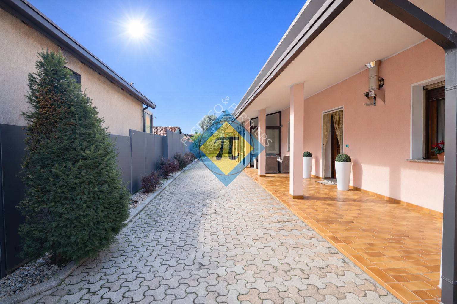 Il cortile uno dei punti forti: davanti hai unarea ampia e ordinata, con pavimentazione recente e recinzione di confine rifatta, quindi subito pronta.