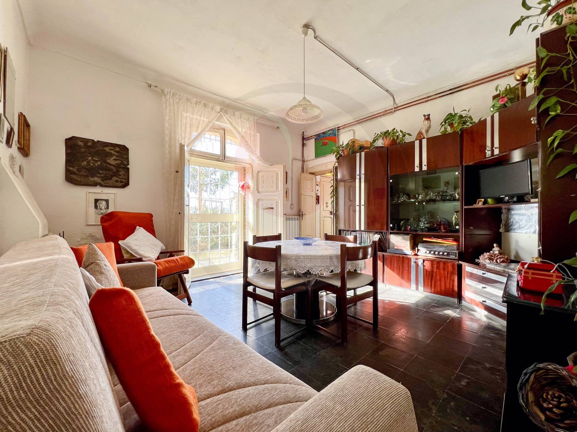Al piano terra, un piccolo disimpegno di ingresso porta da un lato alla zona giorno, dall'altro alla cucina abitabile completa di servizio e accesso a locale cantina e locale garage.
