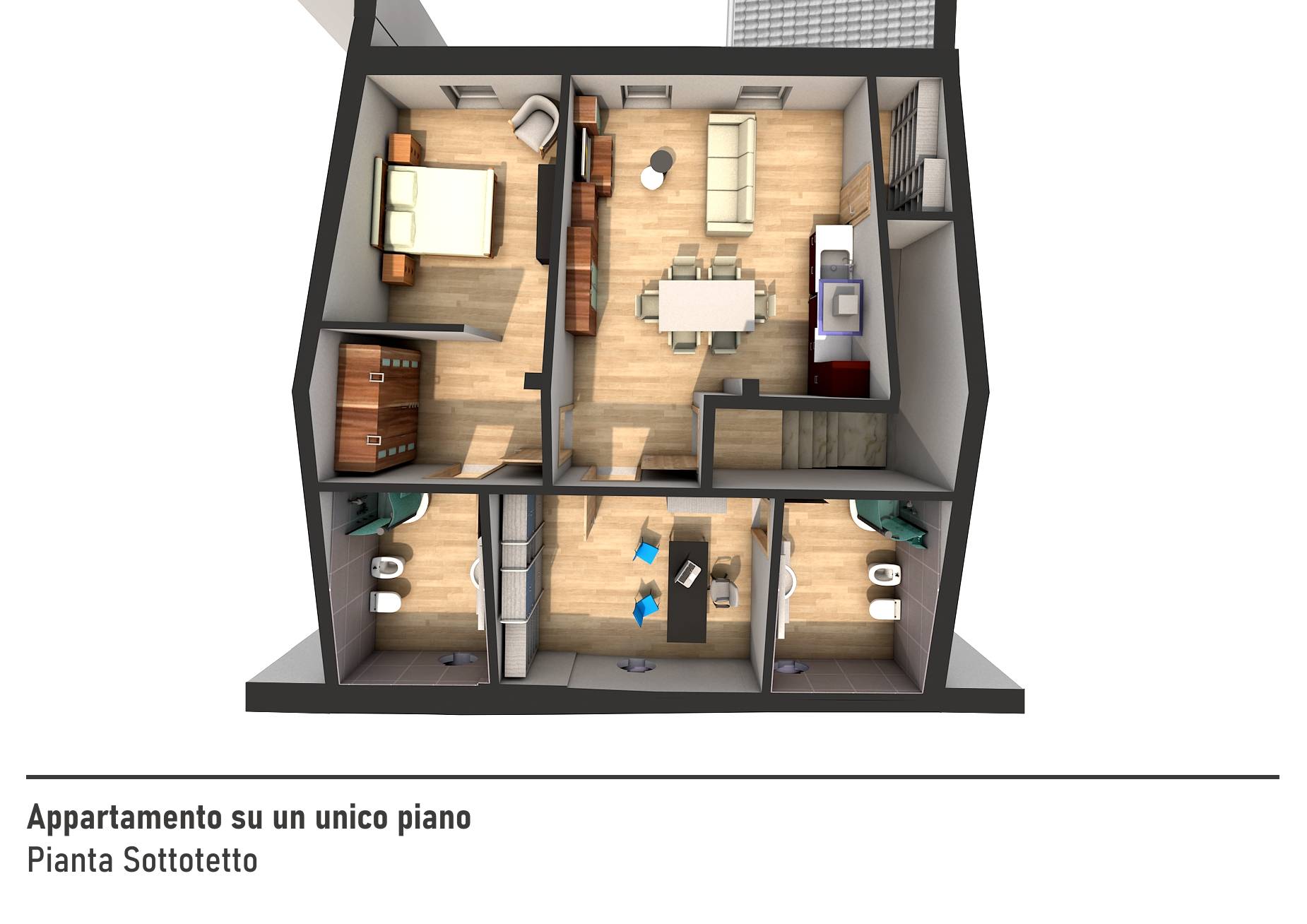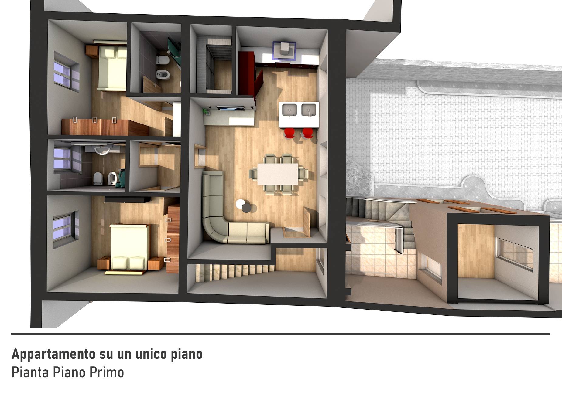 Allo stato attuale prevista la suddivisione degli spazi in quattro appartamenti - su piano unico e su due piani -, ma l'immobile si presta a diverse personalizzazioni, ad es. si potrebbero lasciare al piano terra quattro monolocali ( o due bilocali) e un unico appartamento al piano primo di circa 150 mq con ampio terrazzo oppure potrebbe essere destinato ad un'unica abitazione padronale.