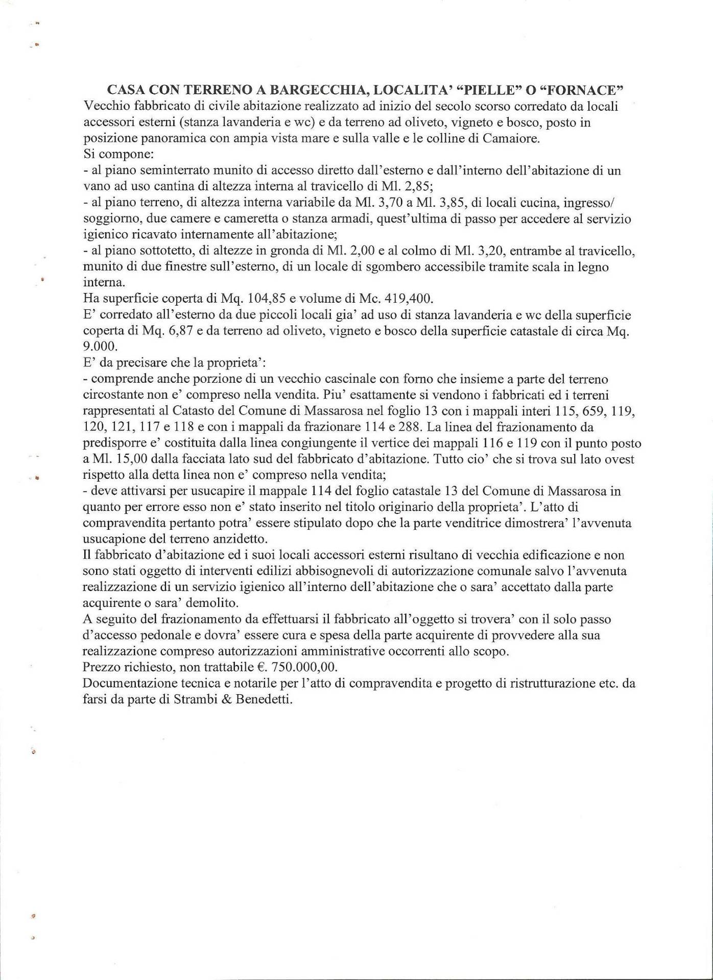 colline della versilia, posta in posizione panoramica con ampia vista sul mare , sulla valle e sulle colline di camaiore vendesi caratteristica casa singola realizzata ad inizio del secolo scorso e corredata da terreno ad oliveto, vigneto e bosco della superficie catastale di circa 9000 mq. l'immobile e' disposto al piano terra da ingresso/soggiorno, cucina con camino, due camere, cameretta, bagno altezze soffitto mt.3,85, al piano sottotetto con altezza al colmo mt. 3,20 grande locale di sgombero accessibile da scala in legno interna.