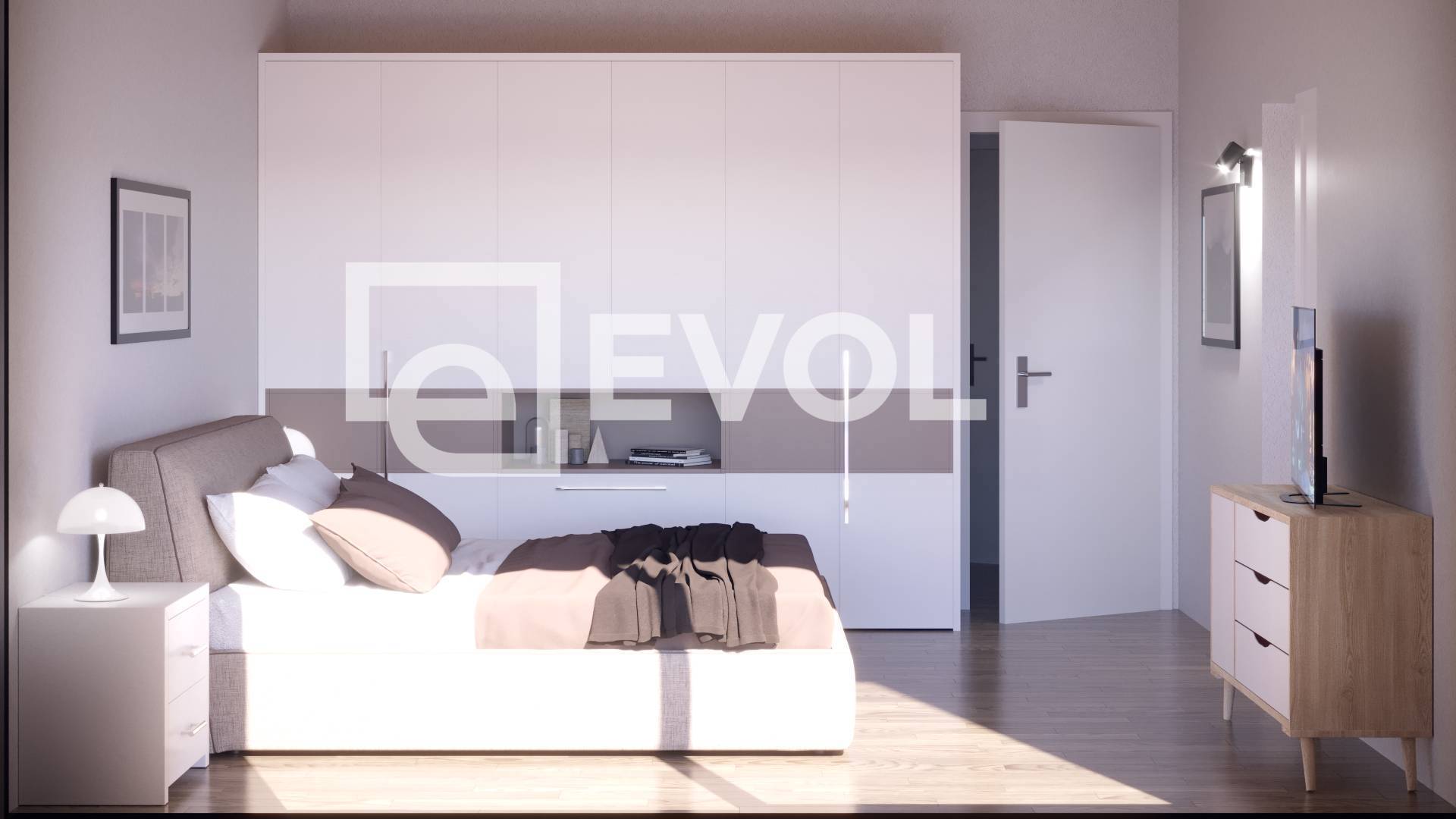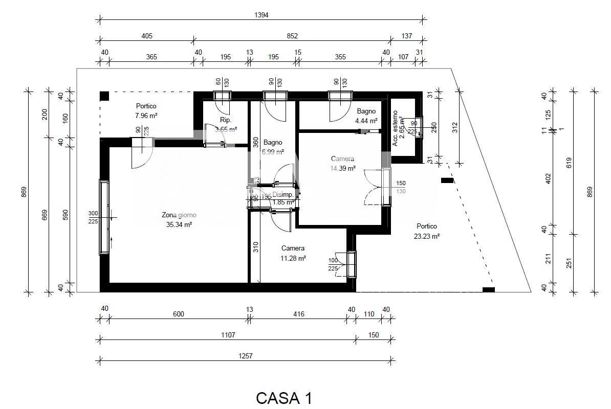 L'attuale progetto prevede due camere, un open space con la cucina, due bagni, portico esterno e lavanderia.