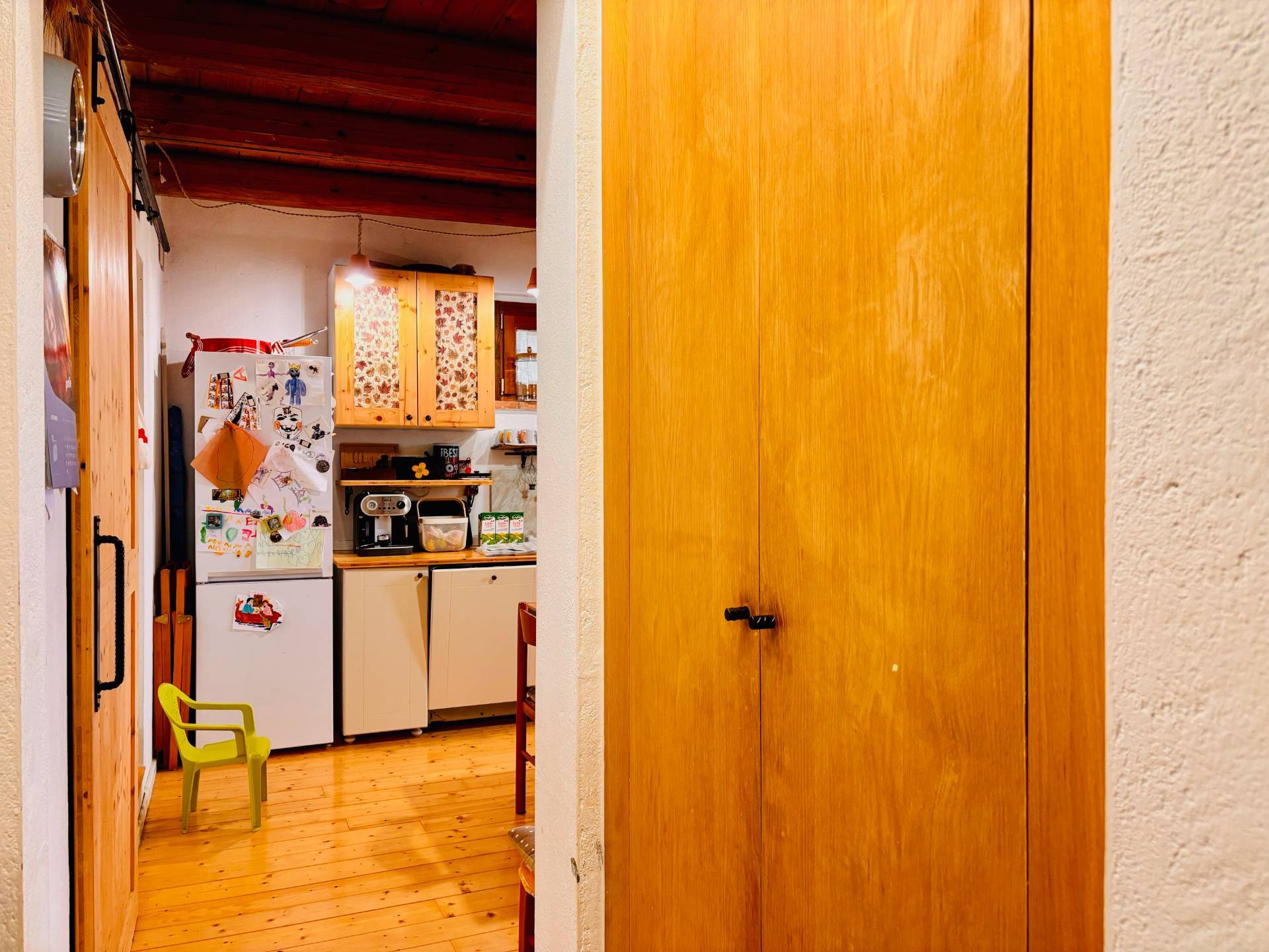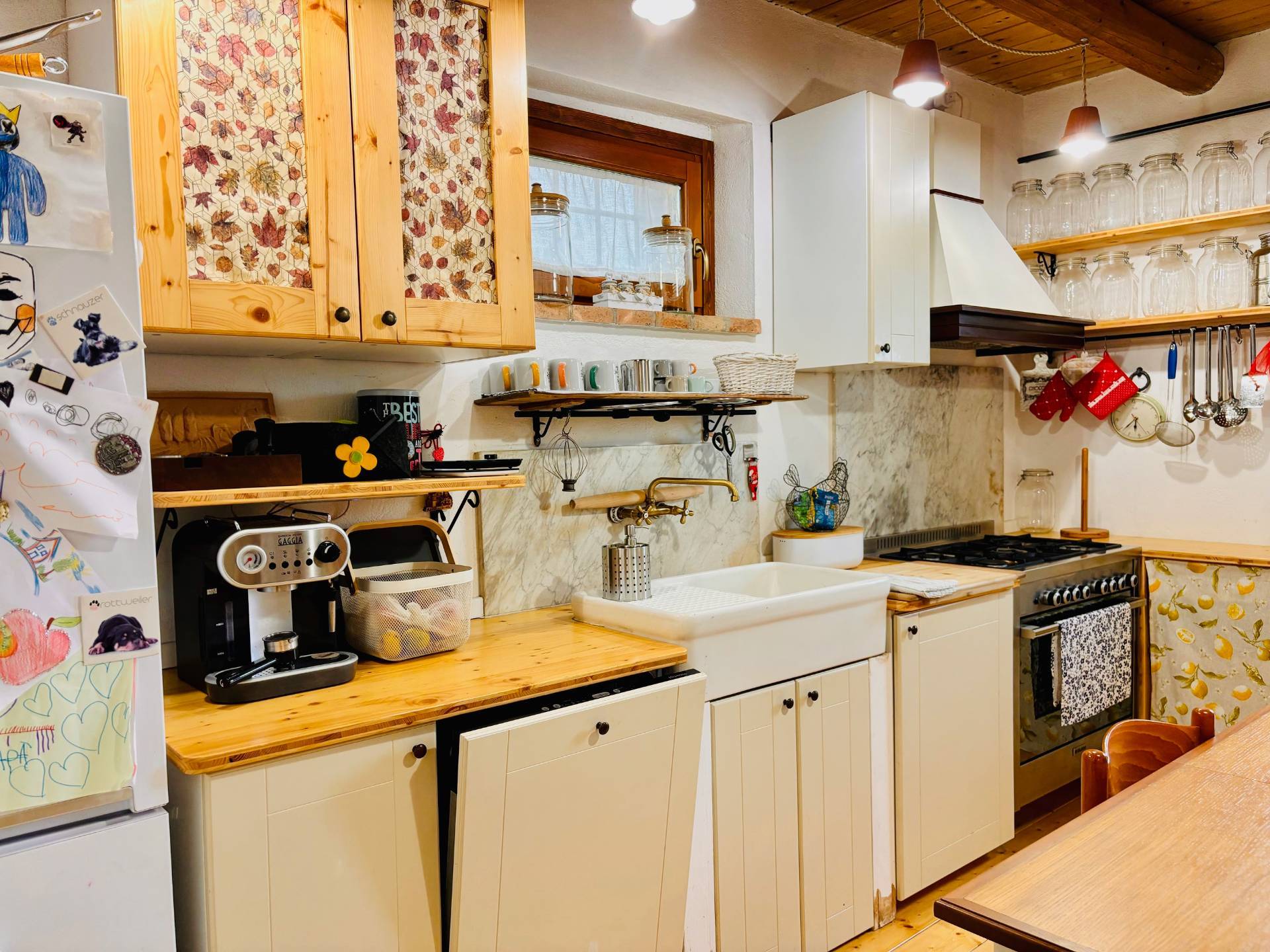 La casa ha l'ingresso a piano terra con TERMOCAMINO a legna che riscalda tutta casa, un piccolo salotto, una comoda cucina, un bagno e un RIPOSTIGLIO sottoscala.