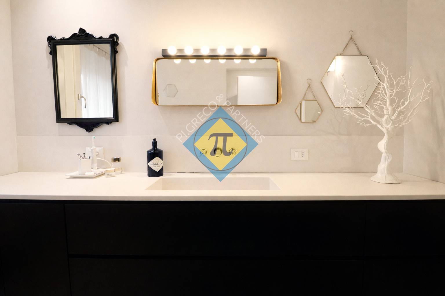 Sul piano principale si sviluppa anche la zona notte, dove la camera padronale con bagno a vista rappresenta una scelta decisa e contemporanea, pensata per chi ama ambienti aperti e soluzioni non convenzionali.