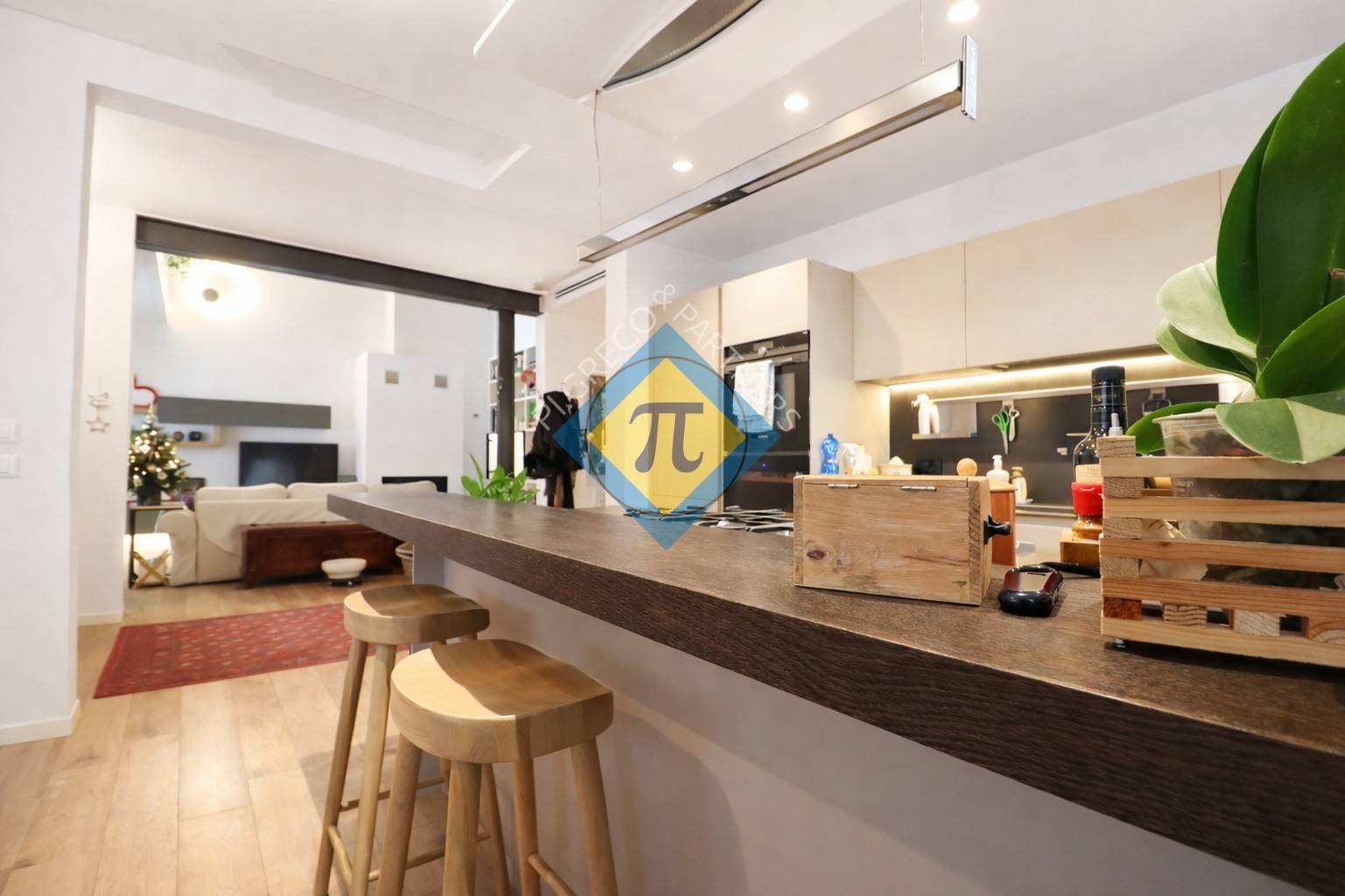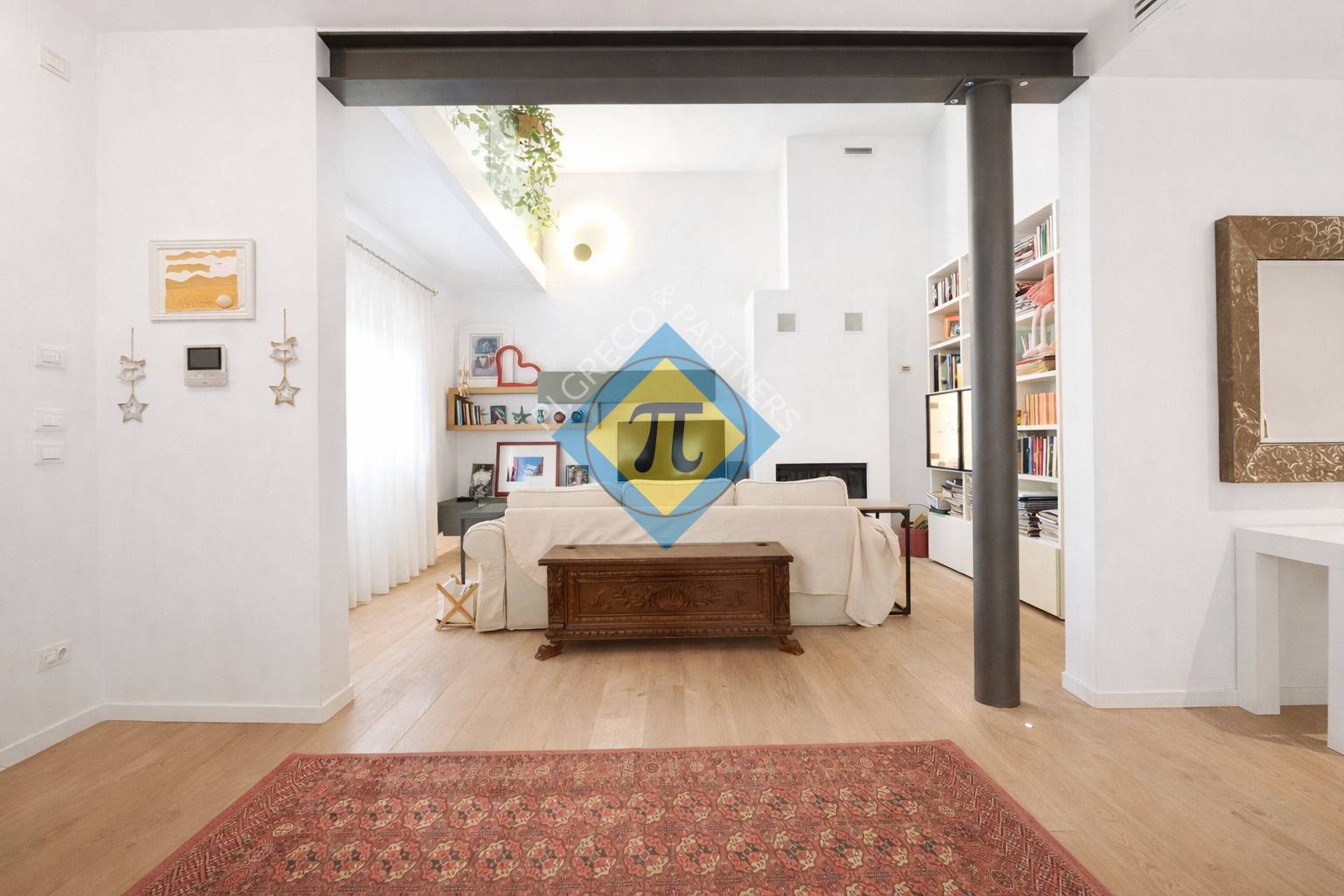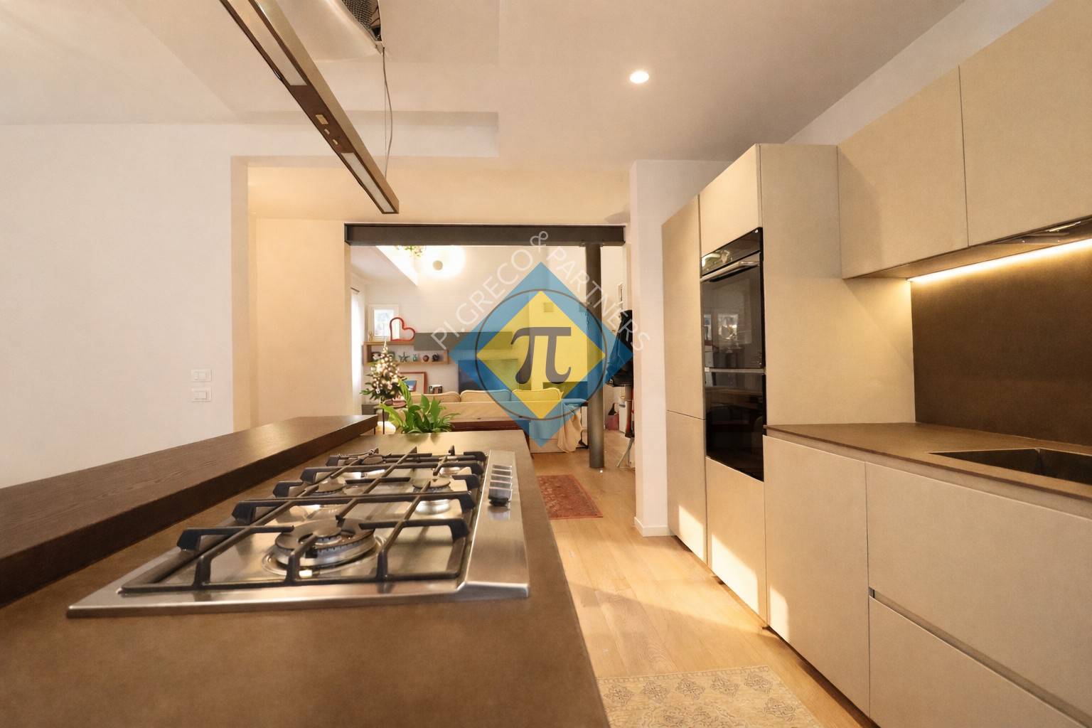 La cucina a vista con penisola, il tavolo e il living convivono in un unico ambiente luminoso, moderno e accogliente, collegato direttamente a un terrazzo di circa 70 mq: uno spazio vero, da vivere dalla primavera allautunno, non il solito balcone di rappresentanza.