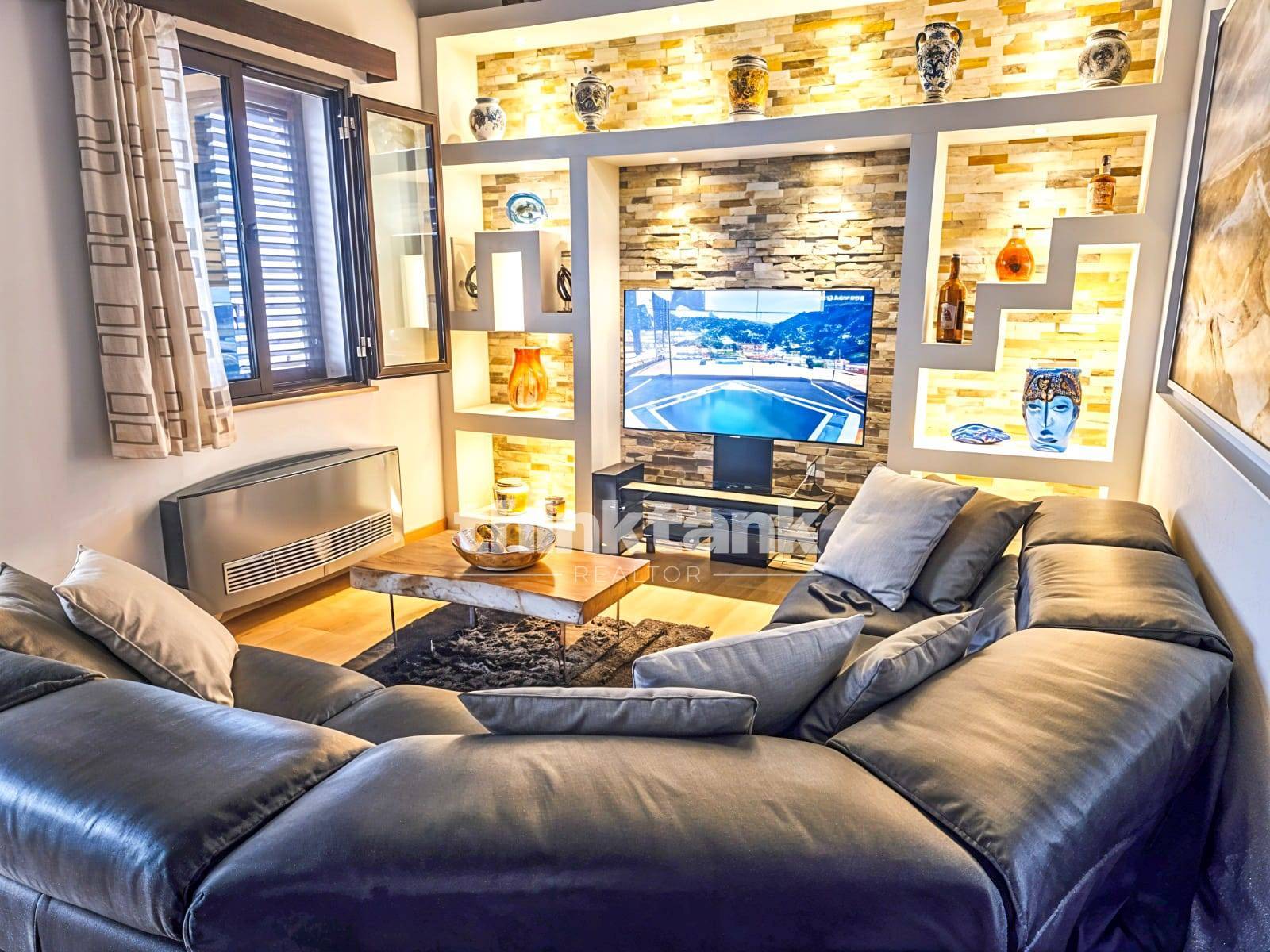 Al primo piano, invece, si apre una zona living con accesso diretto a una grande terrazza panoramica, due camere da letto, un secondo bagno e un pratico cucinotto.