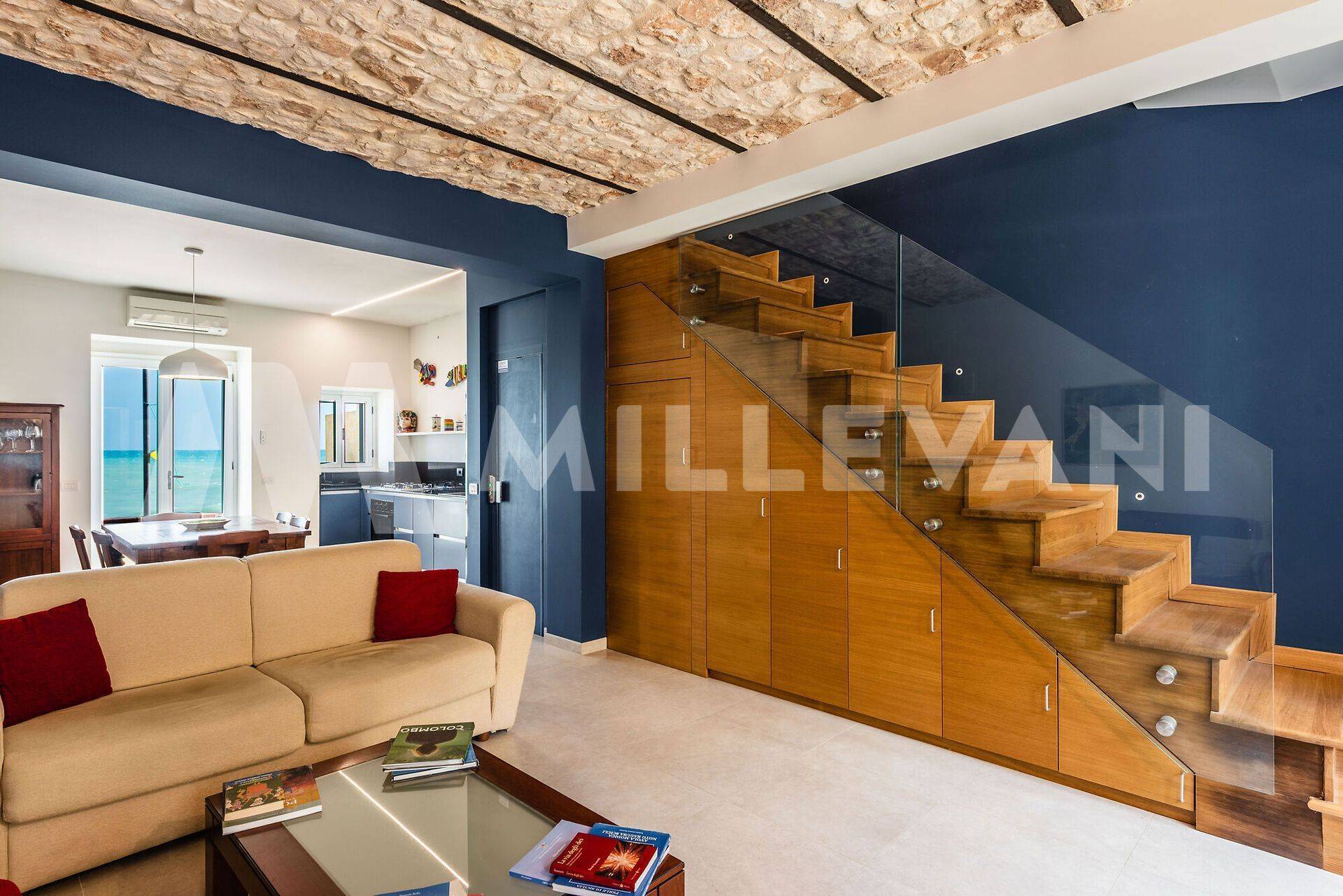 L'edificio si affaccia su due vie ed ha due ingressi al piano terra; entrando dal lungomare ci accoglie una graziosa veranda dove poter trascorre momenti di convivialit ammirando il mare distante solo pochi metri.