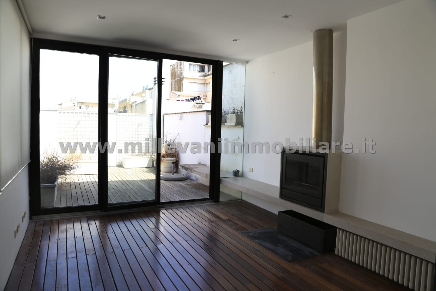 Si accede alla soluzione da un ampio spazio diviso da una vetrata con vano scala interno realizzato con una struttura in metallo e gradini in legno massello dello spessore di 5 cm; la pavimentazione del piano terra realizzata in pietra di Comiso con inserti in pece, mentre il piano primo e secondo in legno rovere cos come i terrazzi e la veranda.