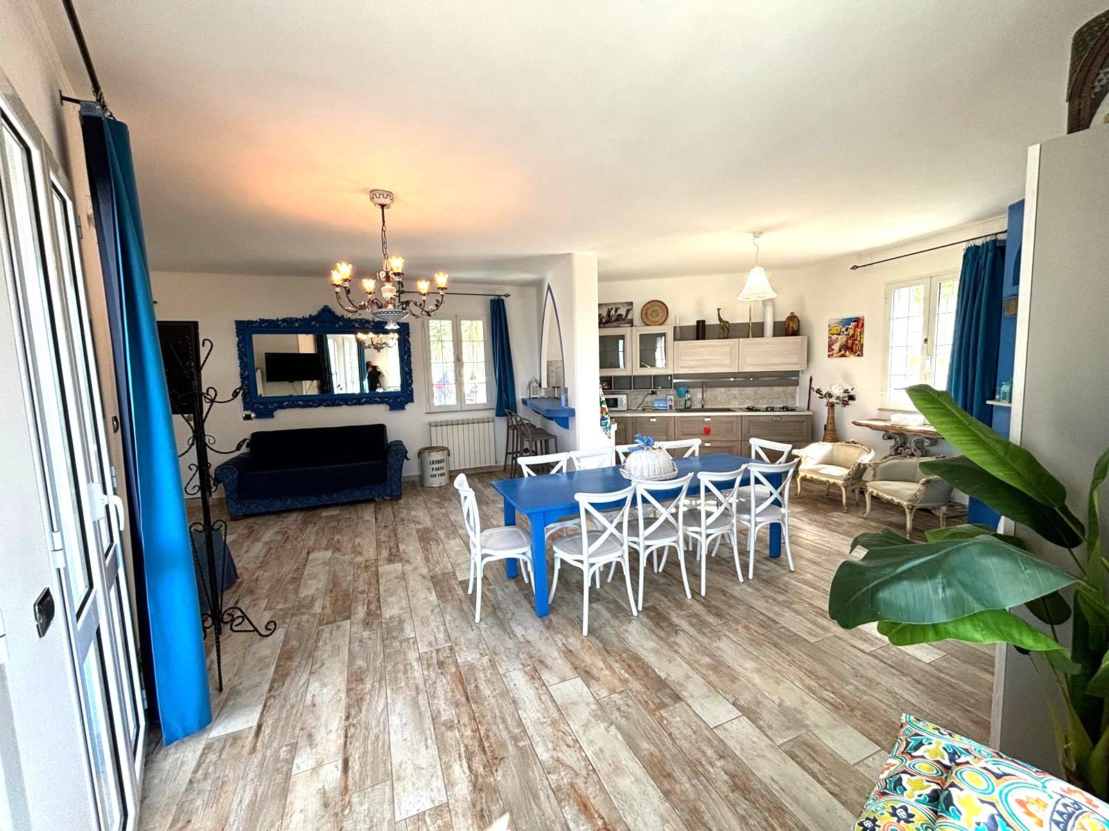 DESCRIZIONE: Villa singola in stile greco mediterraneo dislocata su un solo piano (no barriere architettoniche) delle dimensioni di 144 mq + 15 mq terrazza coperta con vista mare+ 1200 mq circa di spazio esterno sul quale stata montata una piscina fuori terra di 26 mq circa con annessa area prendisole, ed una piccola area giochi per bambini realizzata sulla sabbia.