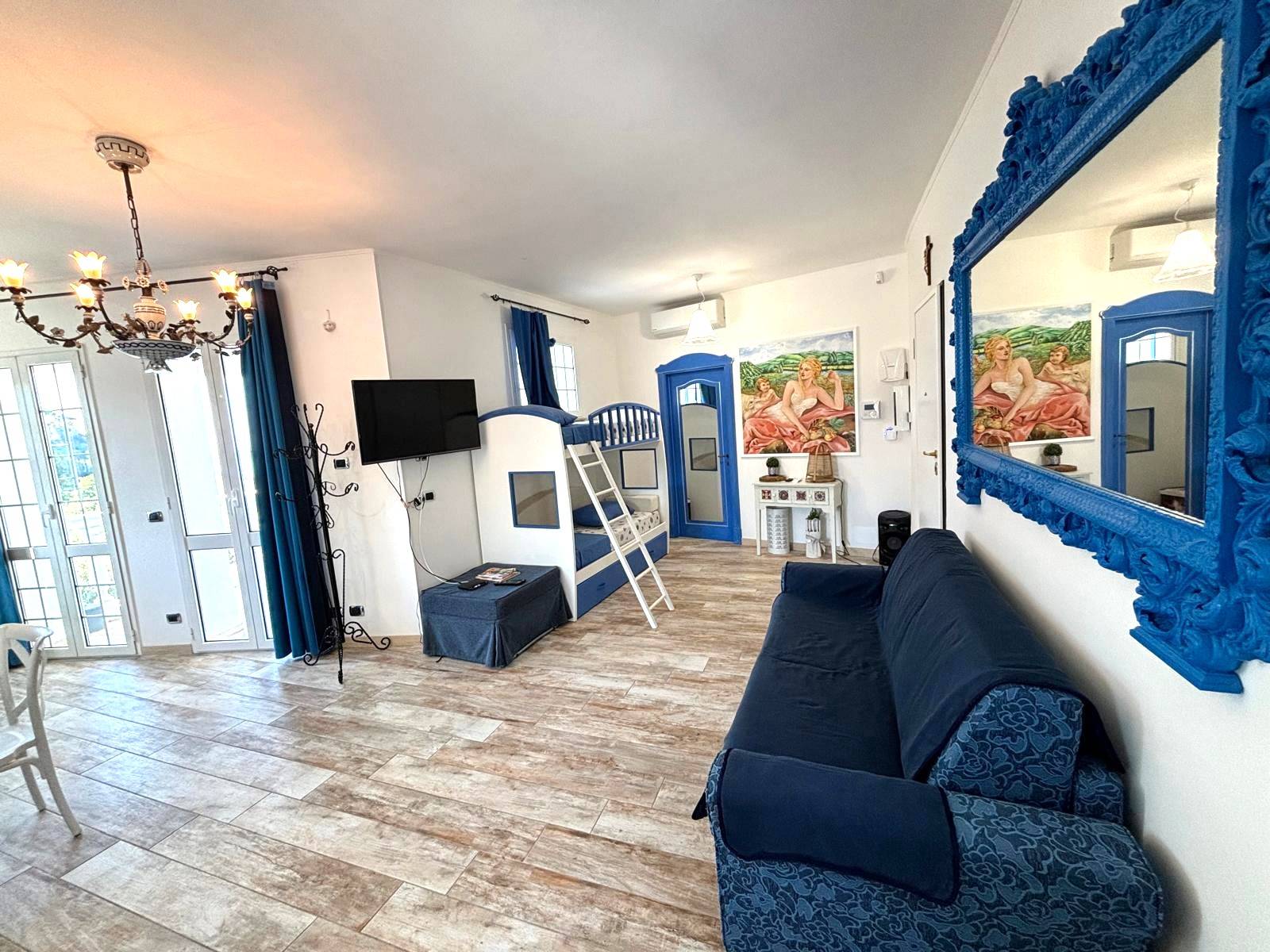 SUDDIVISIONE: ampio soggiorno con cucina a vista, bancone colazione, termo camino, ampio tavolo per 10 persone, comodo divano letto matrimoniale, zona notte composta da tre camere (matrimoniale, media ad uso matrimoniale e singola con letto a castello + letto aggiuntivo) , due bagni entrambi finestrati uno con vasca/doccia jacuzzi idromassaggio e l'altro con doccia idromassaggio.