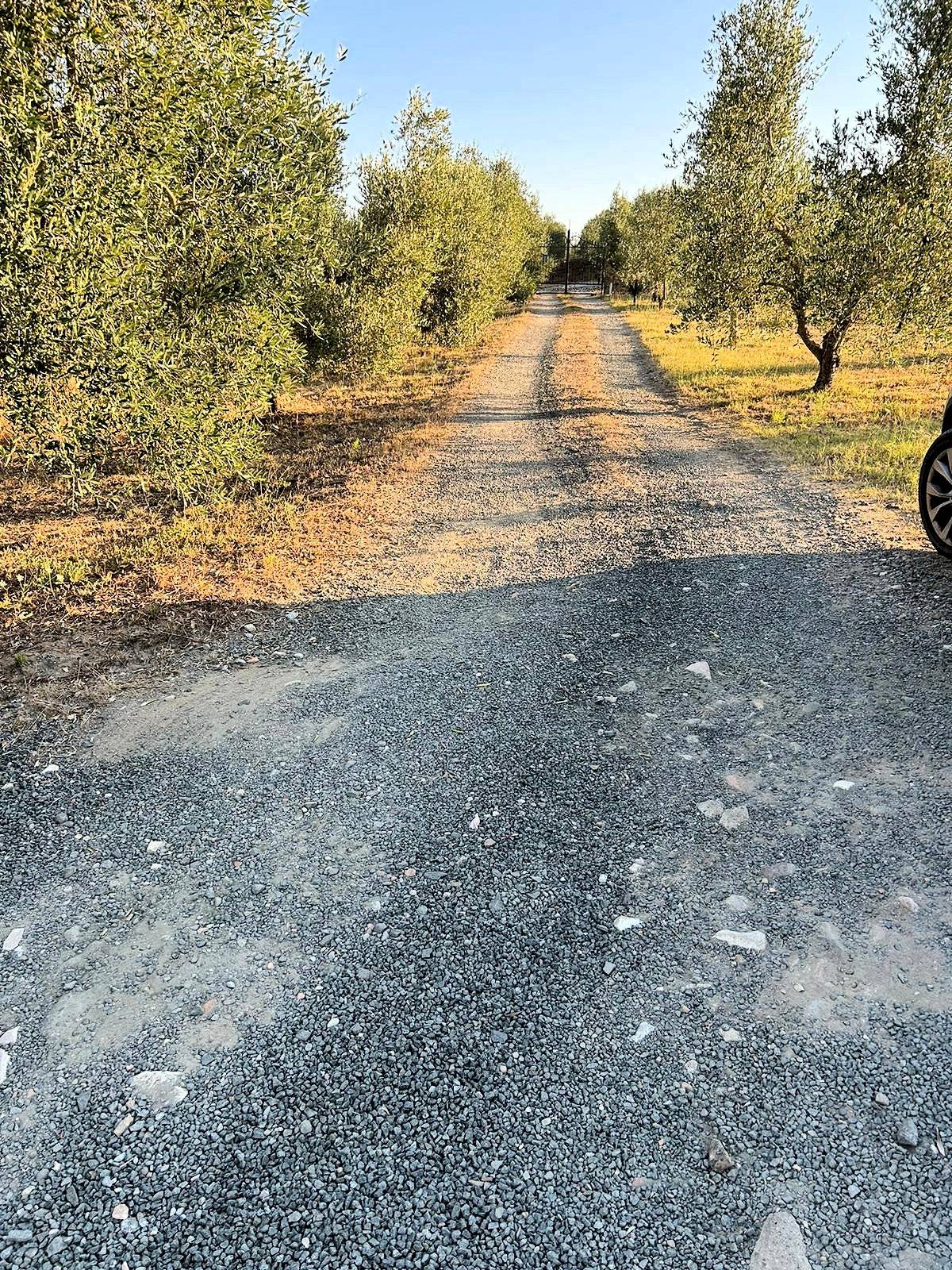 Alla propriet vi si accede da un ingresso con cancello in ferro battuto automatico e strada bianca con un viale alberato servito da illuminazione esterna che porta direttamente alla corte e ai posti auto esterni.
