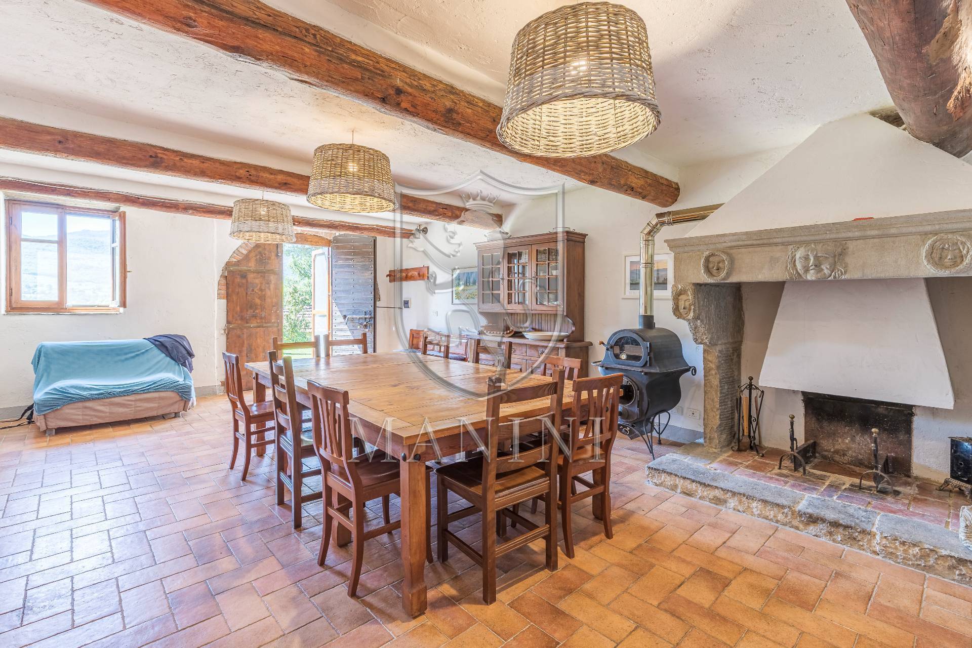 Ogni ambiente curato con gusto: pavimenti in cotto originale, soffitti con travi a vista, camini in pietra, arredi in stile tradizionale e spazi ampi e funzionali.