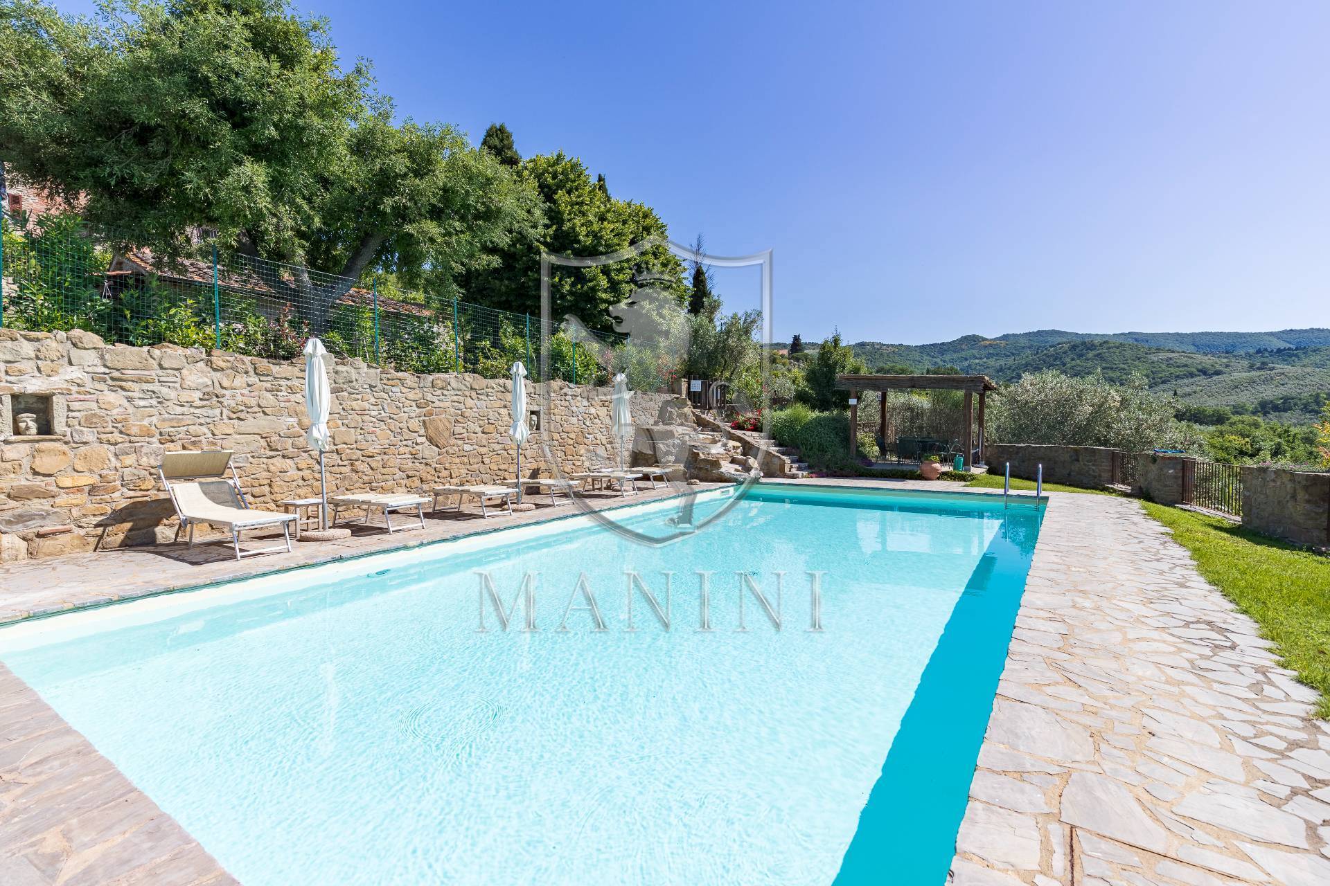Il cuore dellarea esterna la splendida piscina panoramica (12x6 m), situata in posizione dominante, con solarium attrezzato, gazebo ombreggiato, lettini e area lounge: un vero e proprio angolo di paradiso dove rilassarsi ammirando il paesaggio.