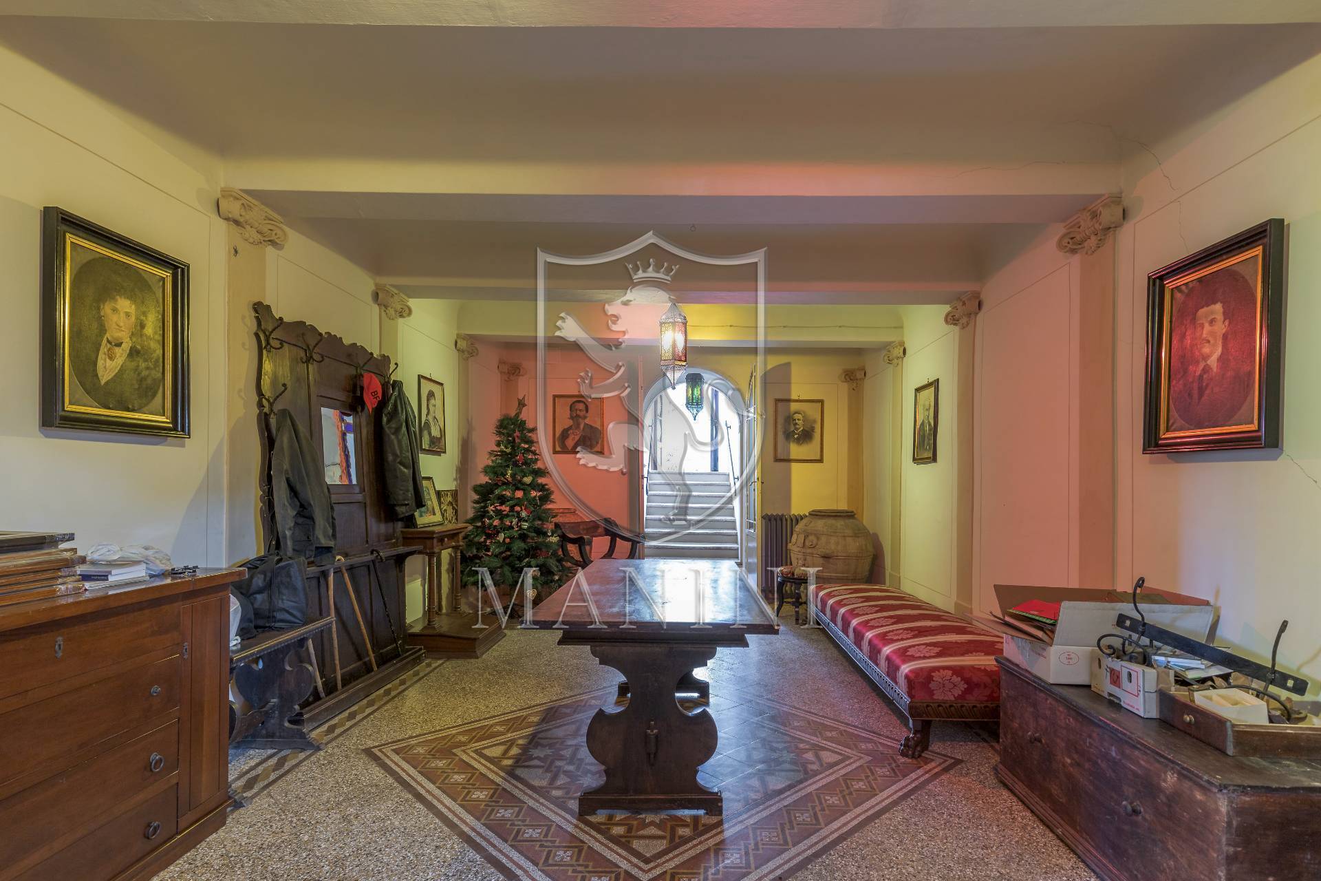 L'appartamento padronale si sviluppa su tre livelli per un totale di circa 565 mq, oltre ad un magazzino disposto su tre livelli per ulteriori 250 mq, il tutto circondato da un parco privato completamente recintato di circa 1.600 mq. Al piano terra troviamo la zona giorno, al centro un ampio ingresso, dal quale si raggiunge un bellissimo salone triplo, con caminetto in muratura affrescato, travi in legno e pavimento in cotto.