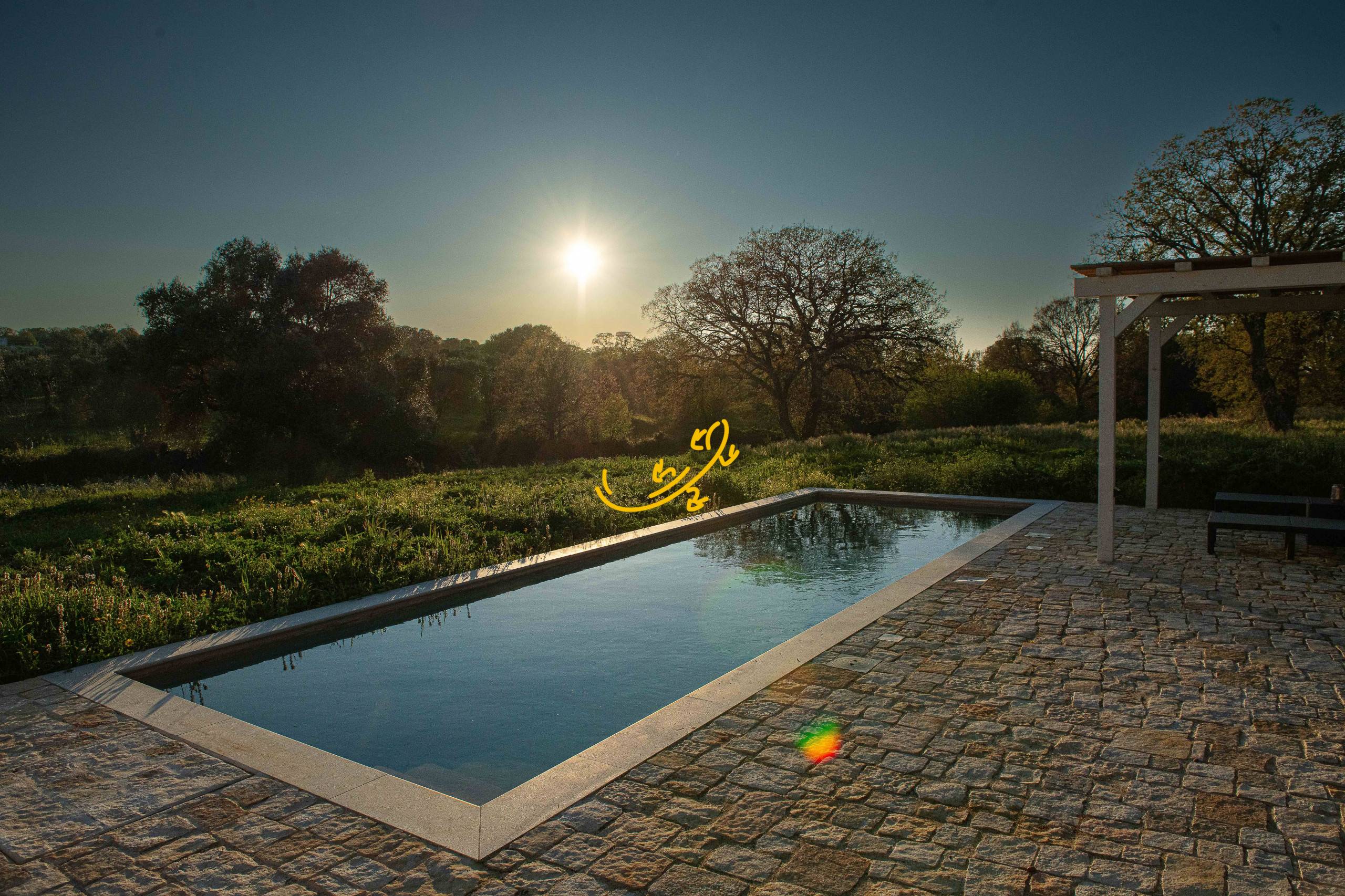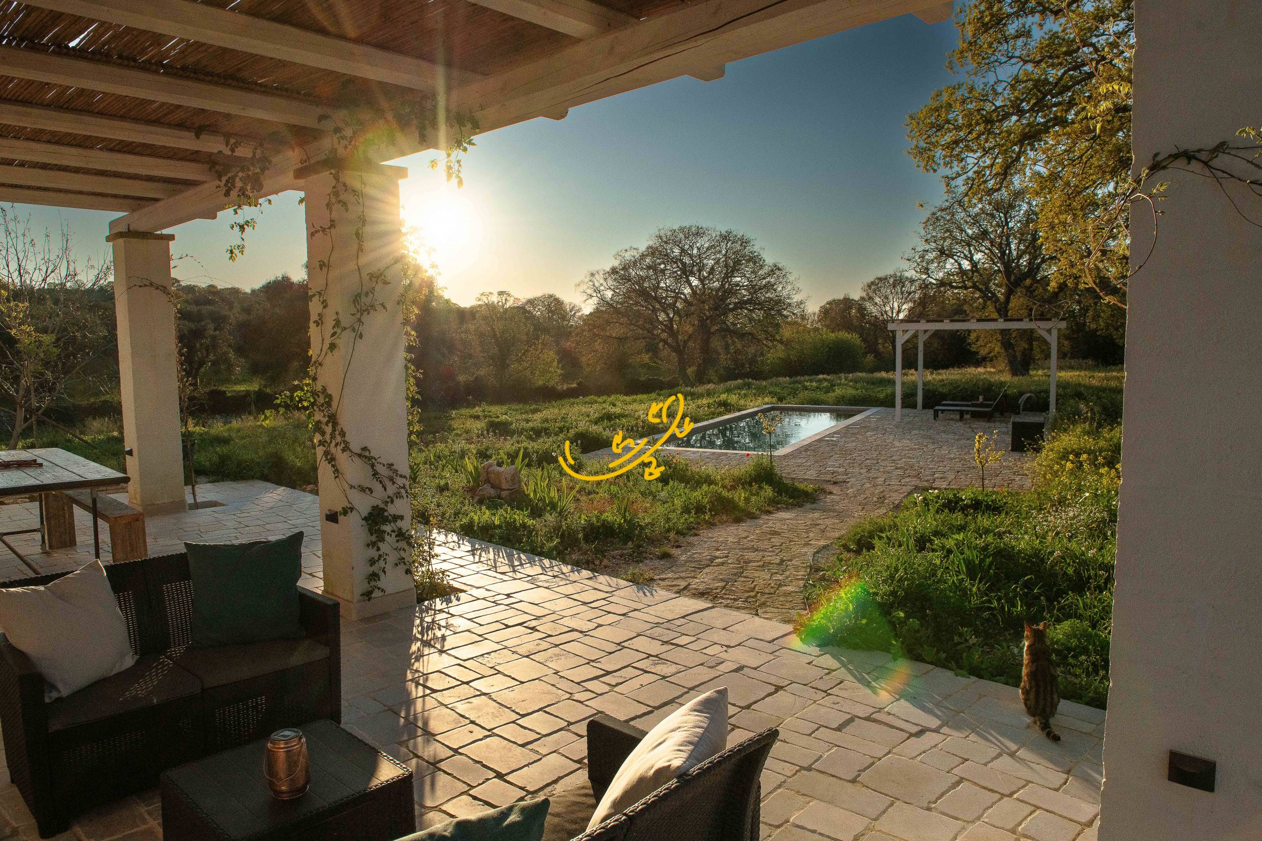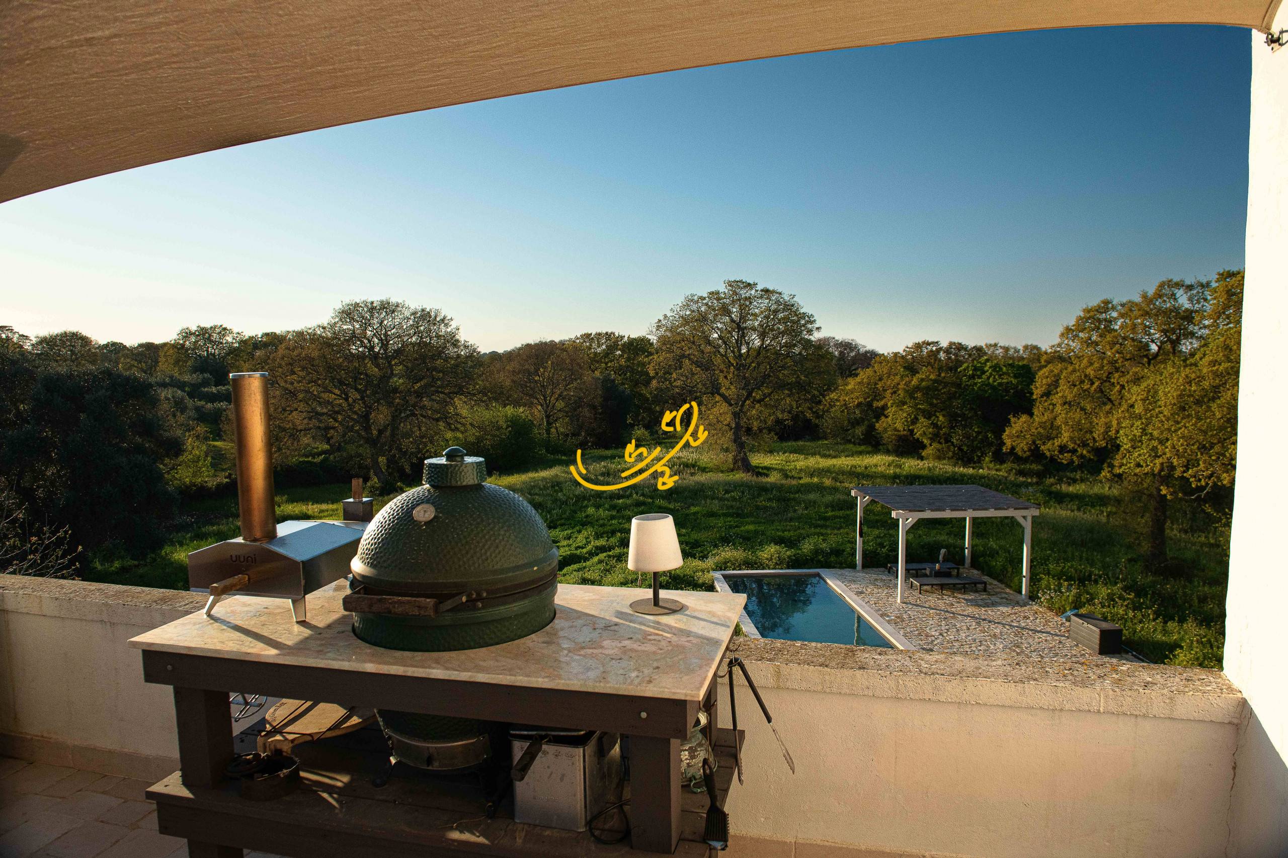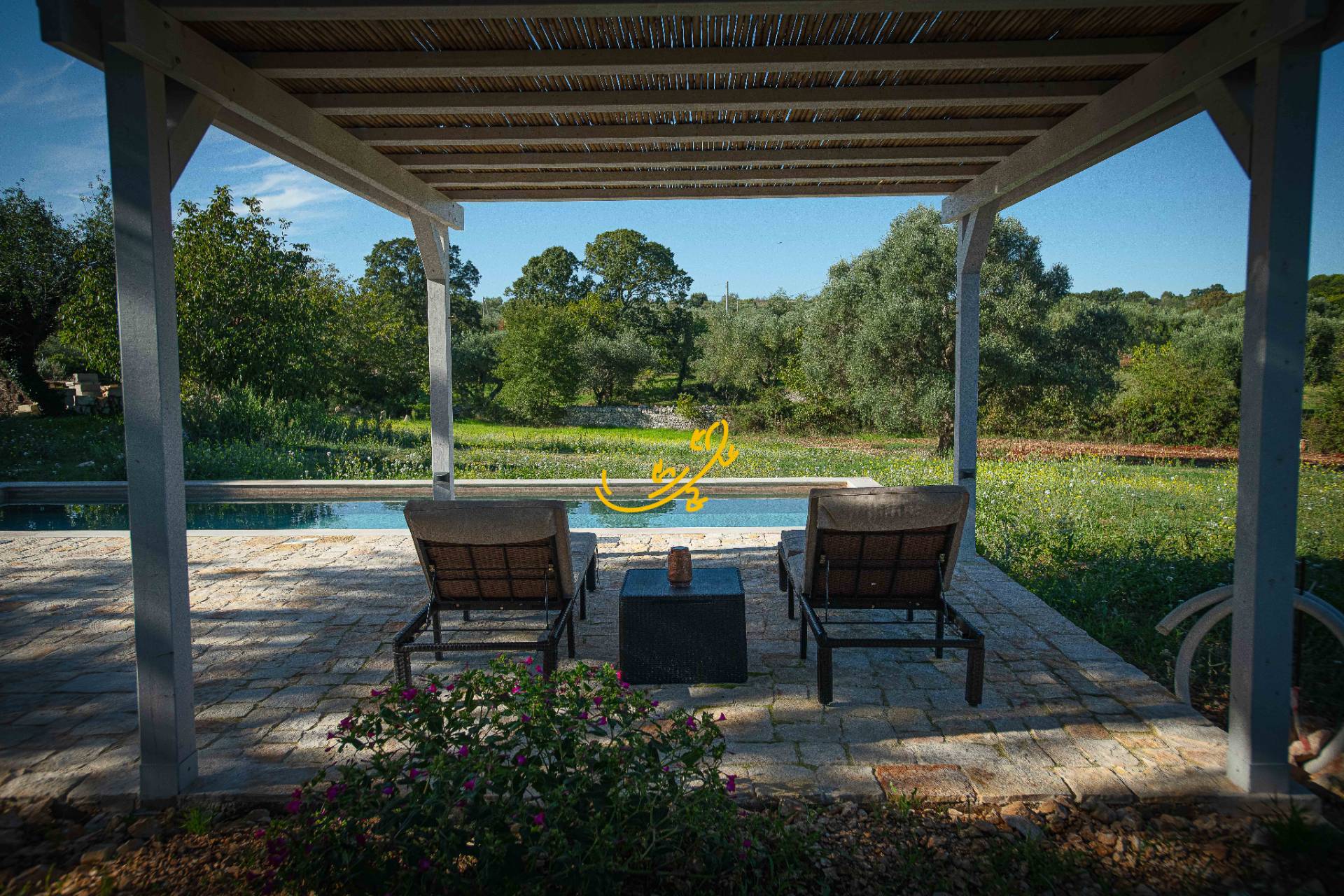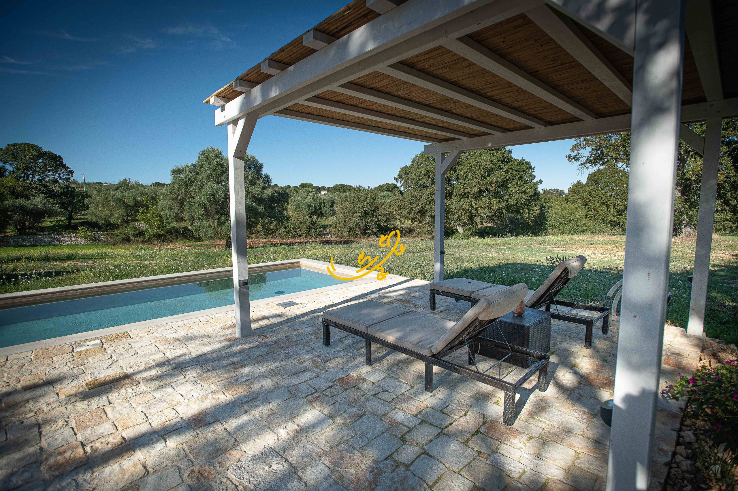 Pergolato con patio con vista sulla piscina.
