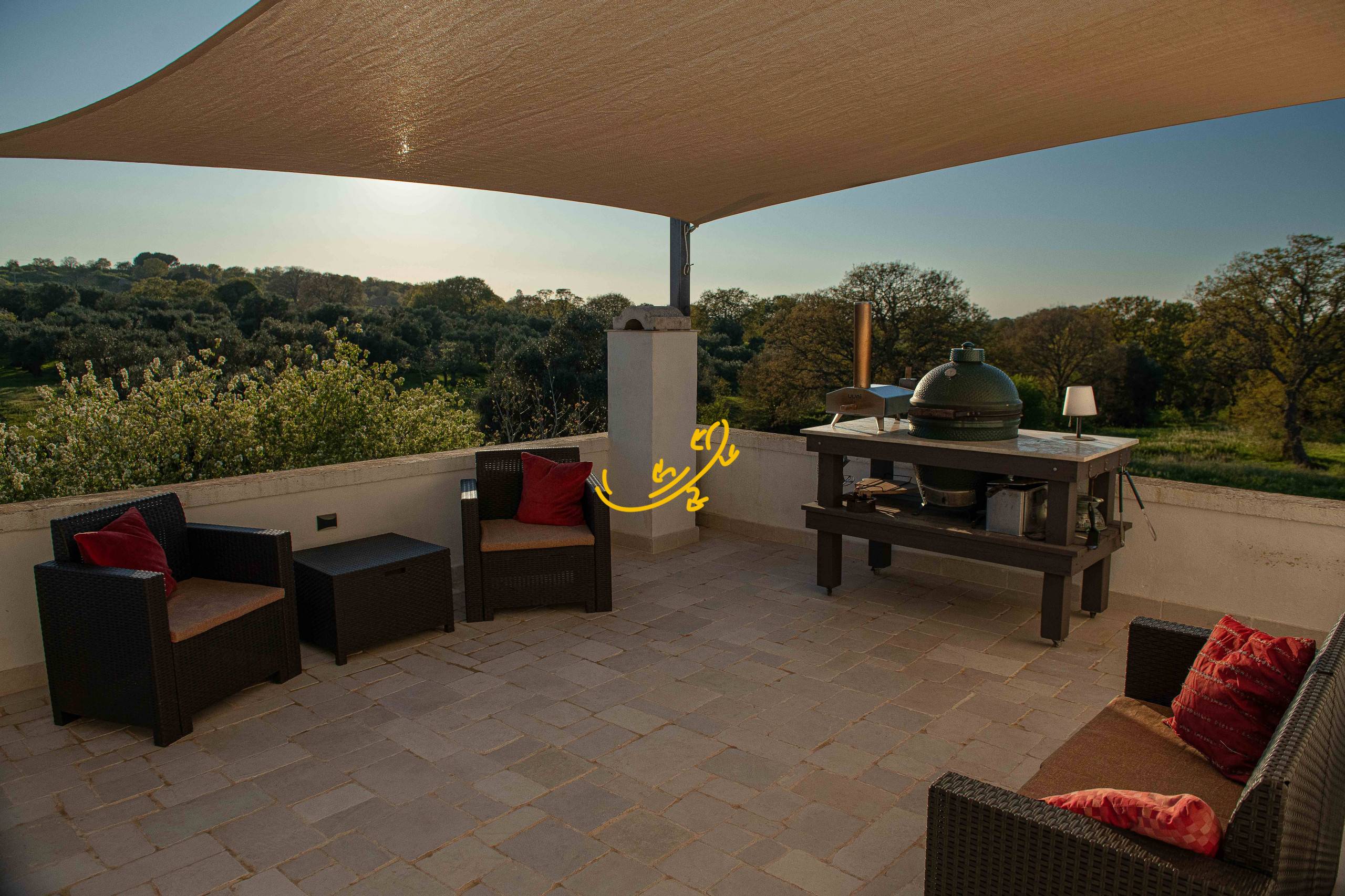Il terreno che circonda la Tenuta di circa 7ettari convertito in biologico caratterizzato da colture di oltre 65 alberi di ulivo e produce olio extravergine di ottima qualit; inoltre ci sono ciliegi, fichi, mele, pere, mele cotogne, mandorle e noci. Un piccolo trullo si trova in uno dei due uliveti.