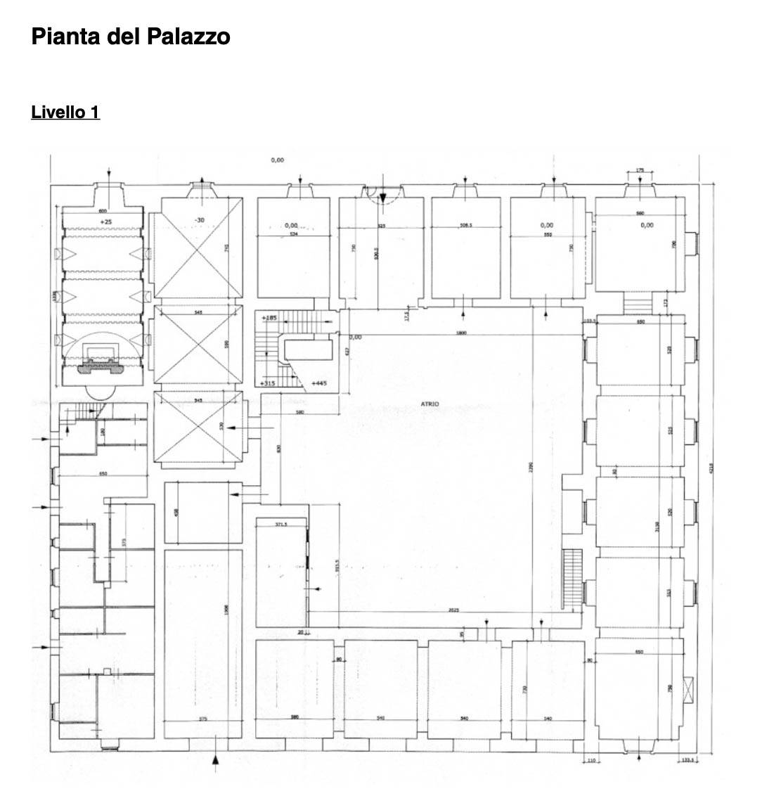 La propriet si compone di un importante corpo principale, un palazzo storico di circa 2.696 mq, sviluppato su pi livelli e caratterizzato da ampi ambienti, saloni e spazi interni generosi, arricchiti dalla presenza di una chiesa interna che rende il complesso ancora pi suggestivo.