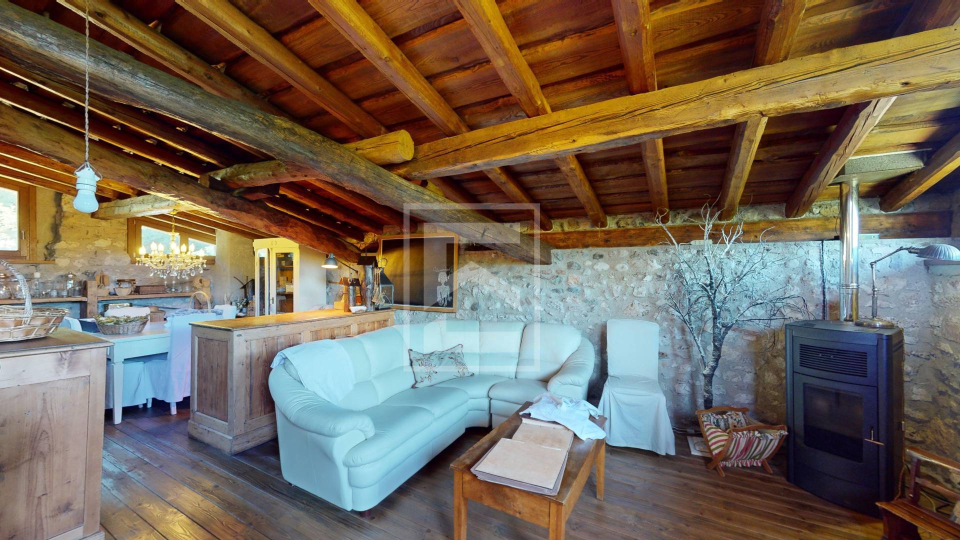 Dal porticato si accede alla zona soggiorno e cucina dove subito si viene accolti dall'atmosfera calda e conviviale che solo questi immobili sanno trasmettere.