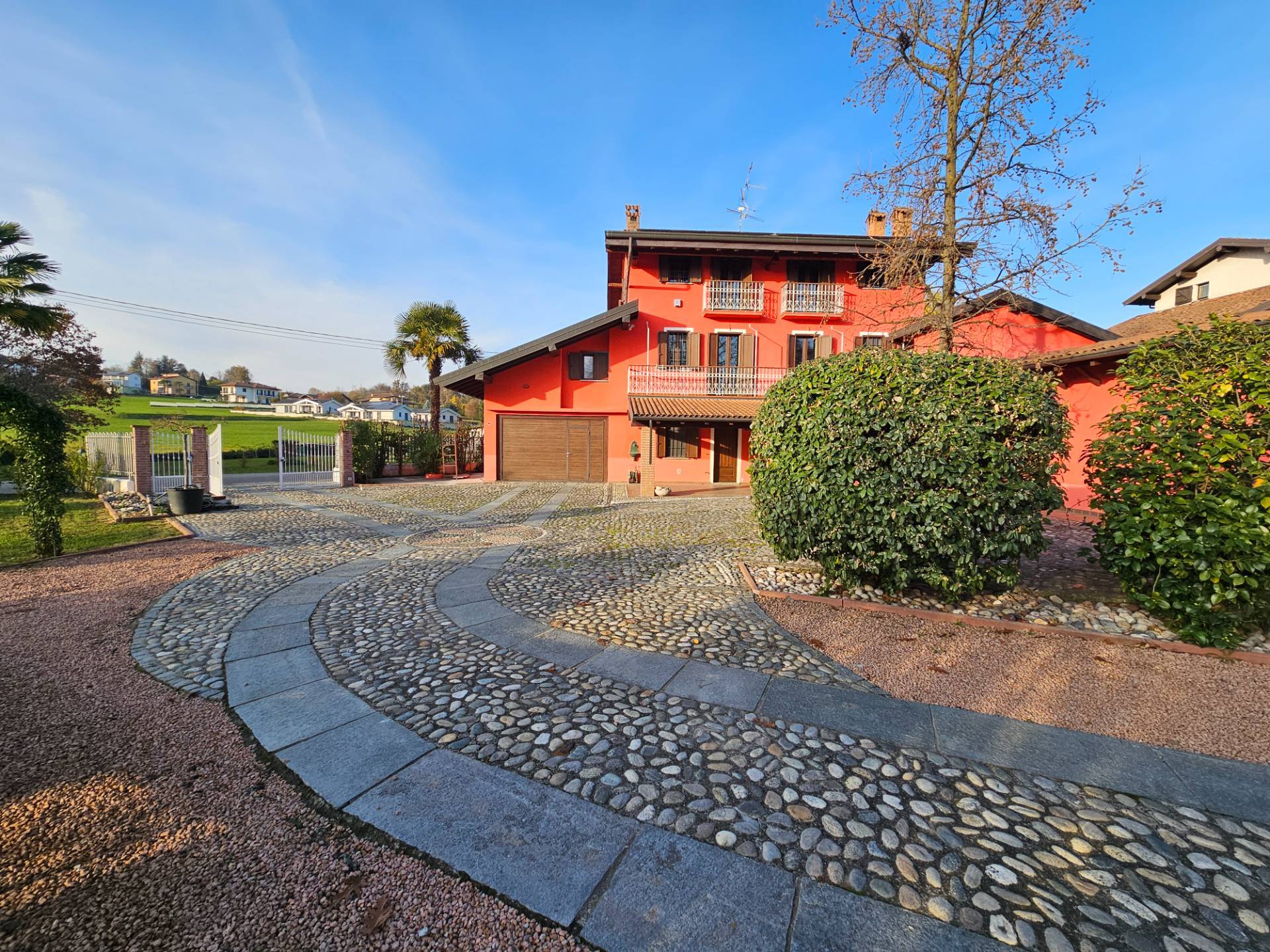 L'ingresso all'abitazione dalla zona porticata, direttamente sulla zona giorno, composta da un accogliente salotto con camino, dalla cucina abitabile con isola centrale e dalla sala da pranzo con soffitto in volta a muratura; al piano terra troviamo inoltre una comoda dispensa, il bagno completo di doccia e il ripostiglio/lavanderia, collegato ad un primo box auto. Al piano superiore un secondo soggiorno con camino, affacciato sulla luminosa balconata, due camere matrimoniali, di cui una con cabina armadio e bagno privato, uno studio ed il bagno padronale con vasca idromassaggio.
