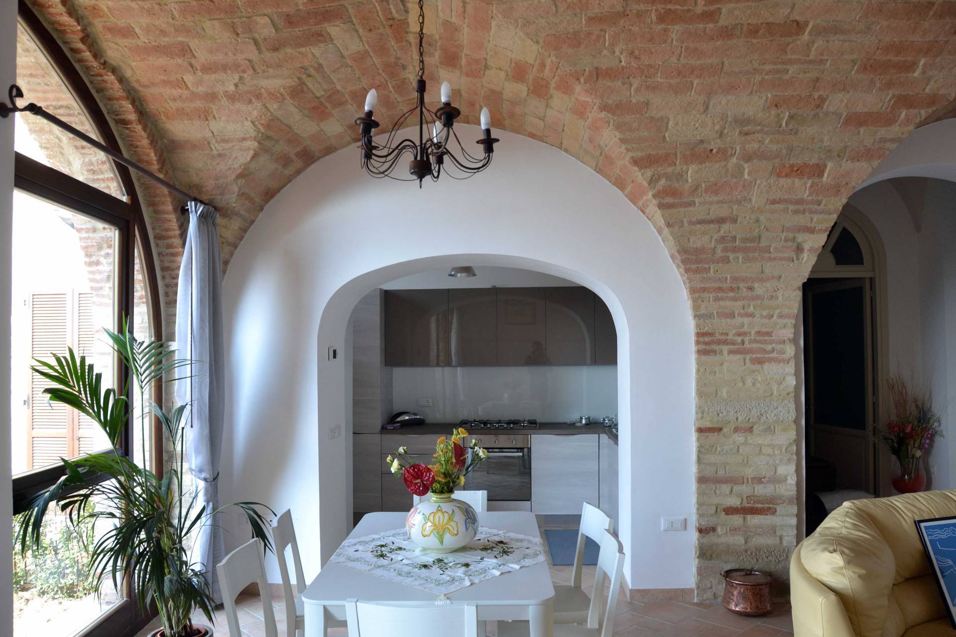 L'appartamento ha un ampio soggiorno con angolo cottura, locale molto particolare, con pareti ad arco in mattoni faccia vista; tre camere matrimoniali, due bagni, ripostiglio, lavanderia ed ampio terrazzo panoramico.