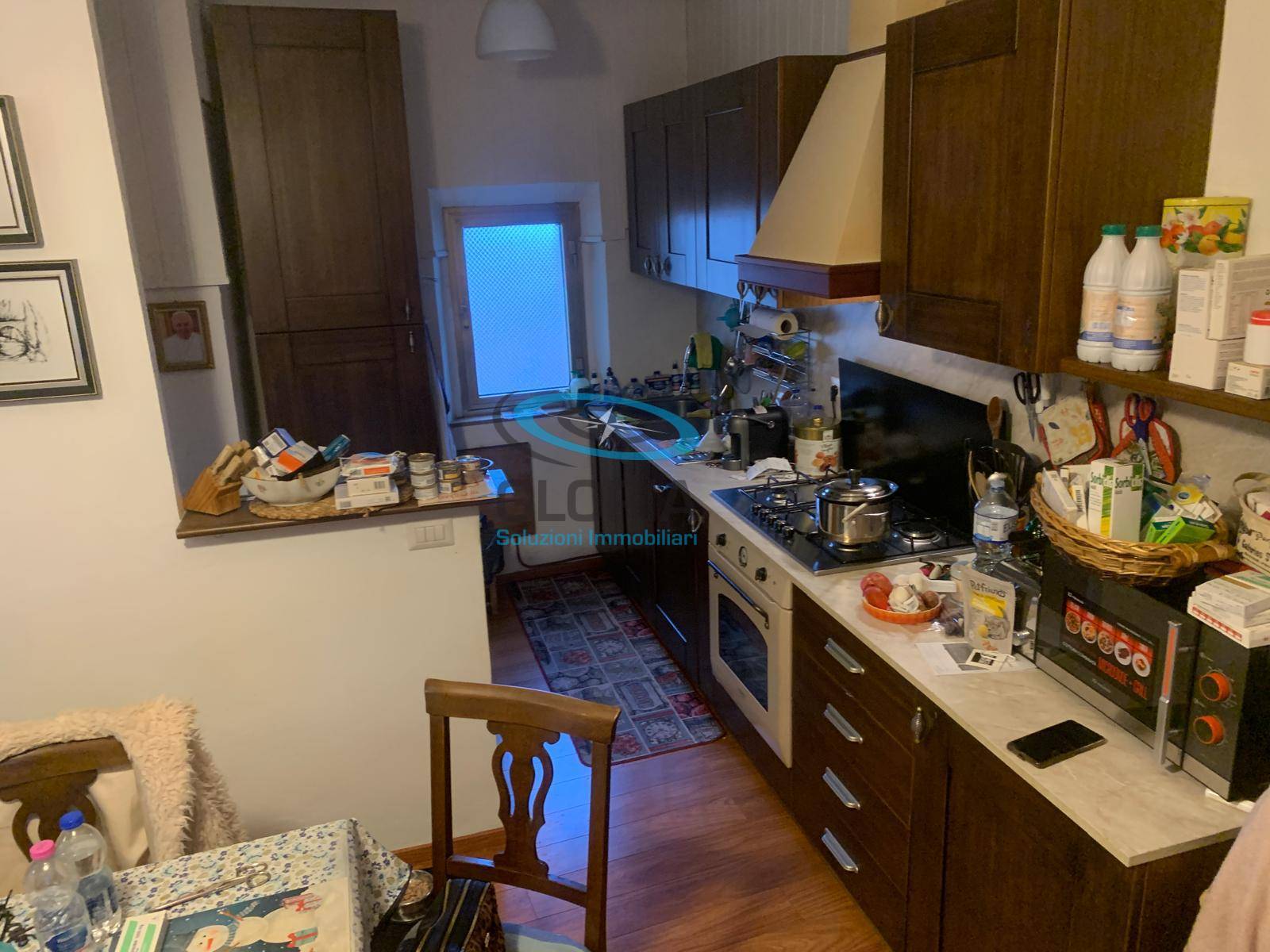 La cucina, anch'essa completamente arredata, adiacente al soggiorno, completa il piano terra un ripostiglio ampio e un bagno con doccia.