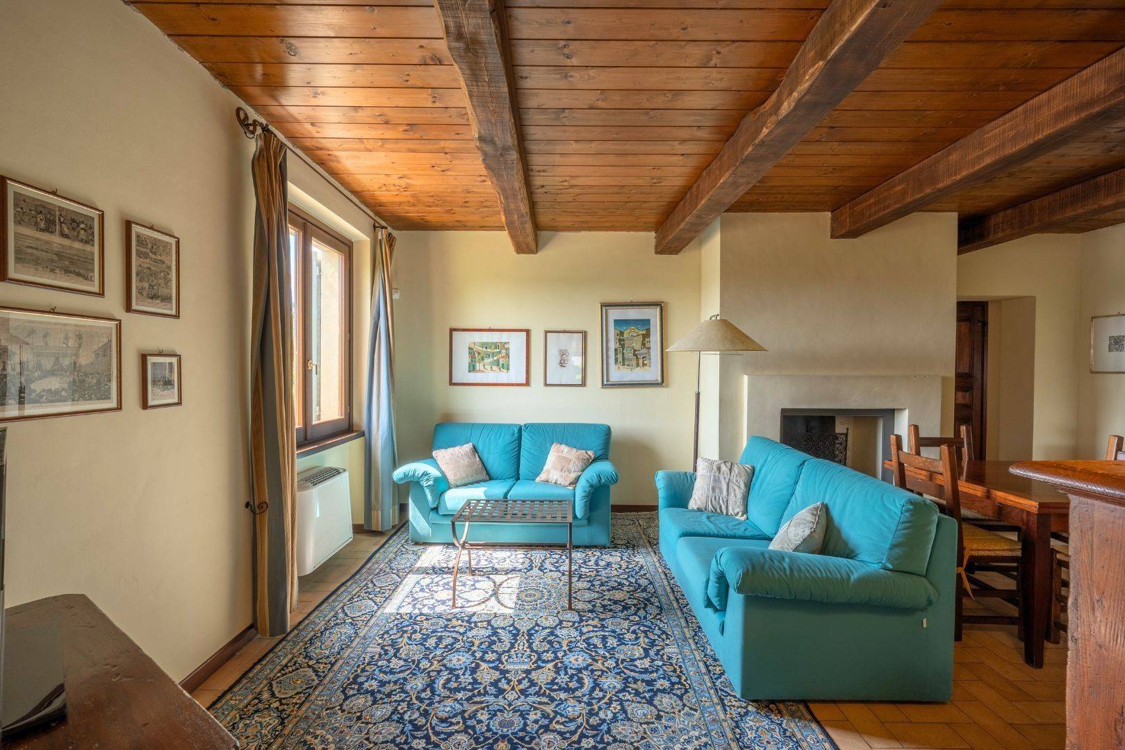 I soffitti con travature in legno, le arcate in pietra e mattoni, i camini tradizionali e le piastrelle decorate in ceramica artigianale delle cucine conferiscono calore e autenticit agli spazi interni.