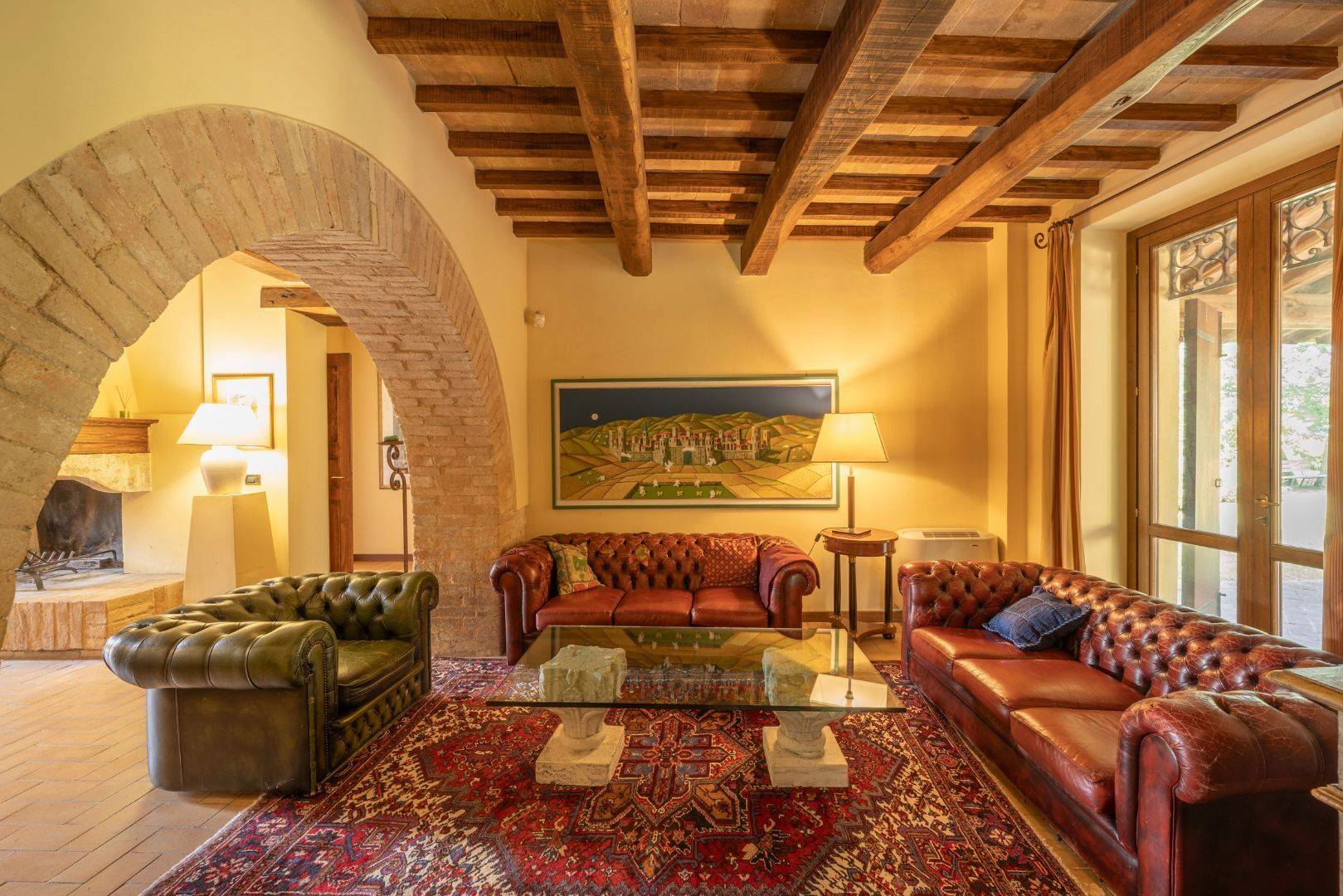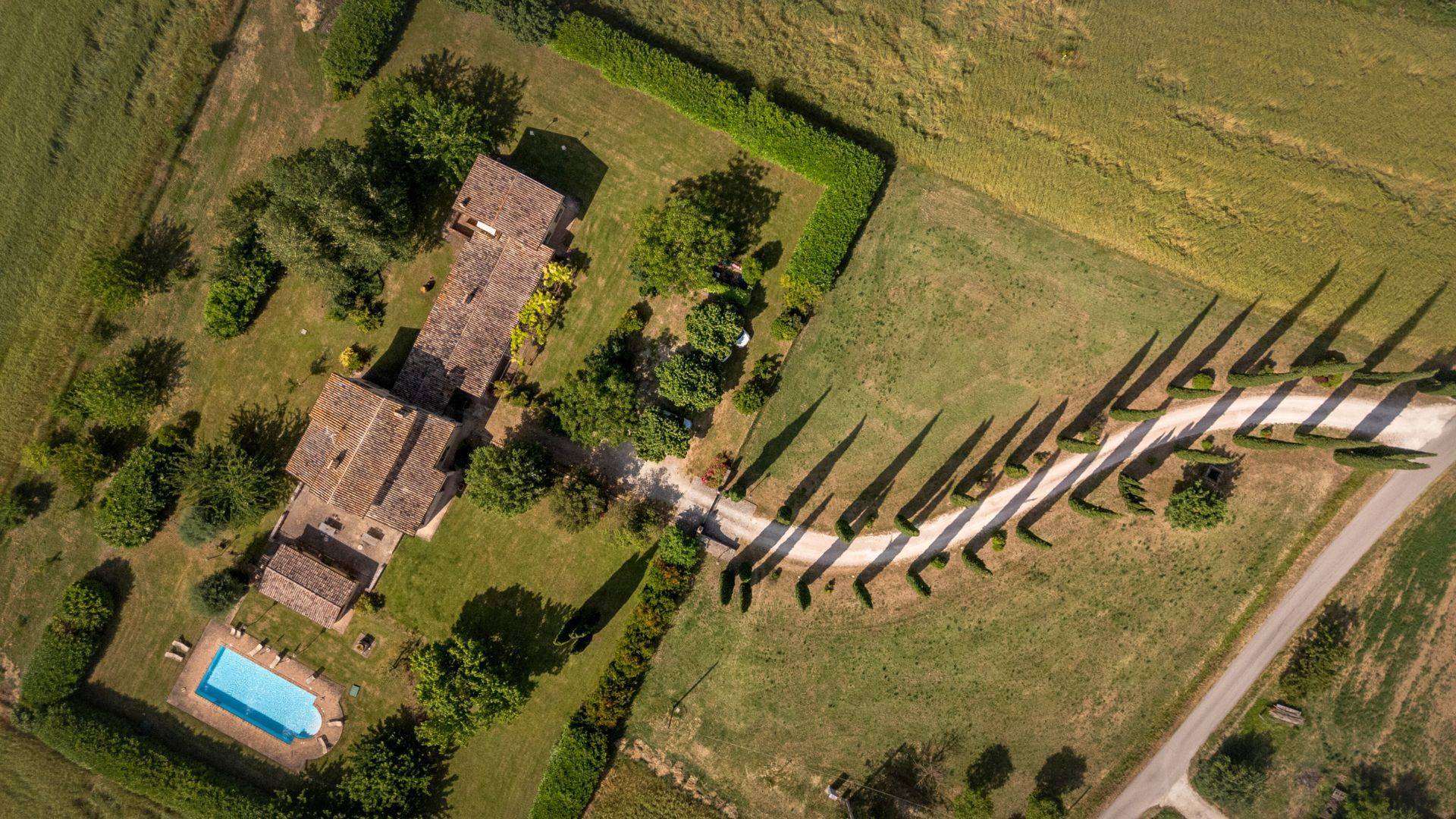 In totale, la casa colonica ospita 11 camere e 11 bagni, distribuiti in ambienti funzionali e accoglienti, caratterizzati da pavimenti in cotto, soffitti con travi in legno a vista e arredi su misura in perfetto stile rustico-elegante.