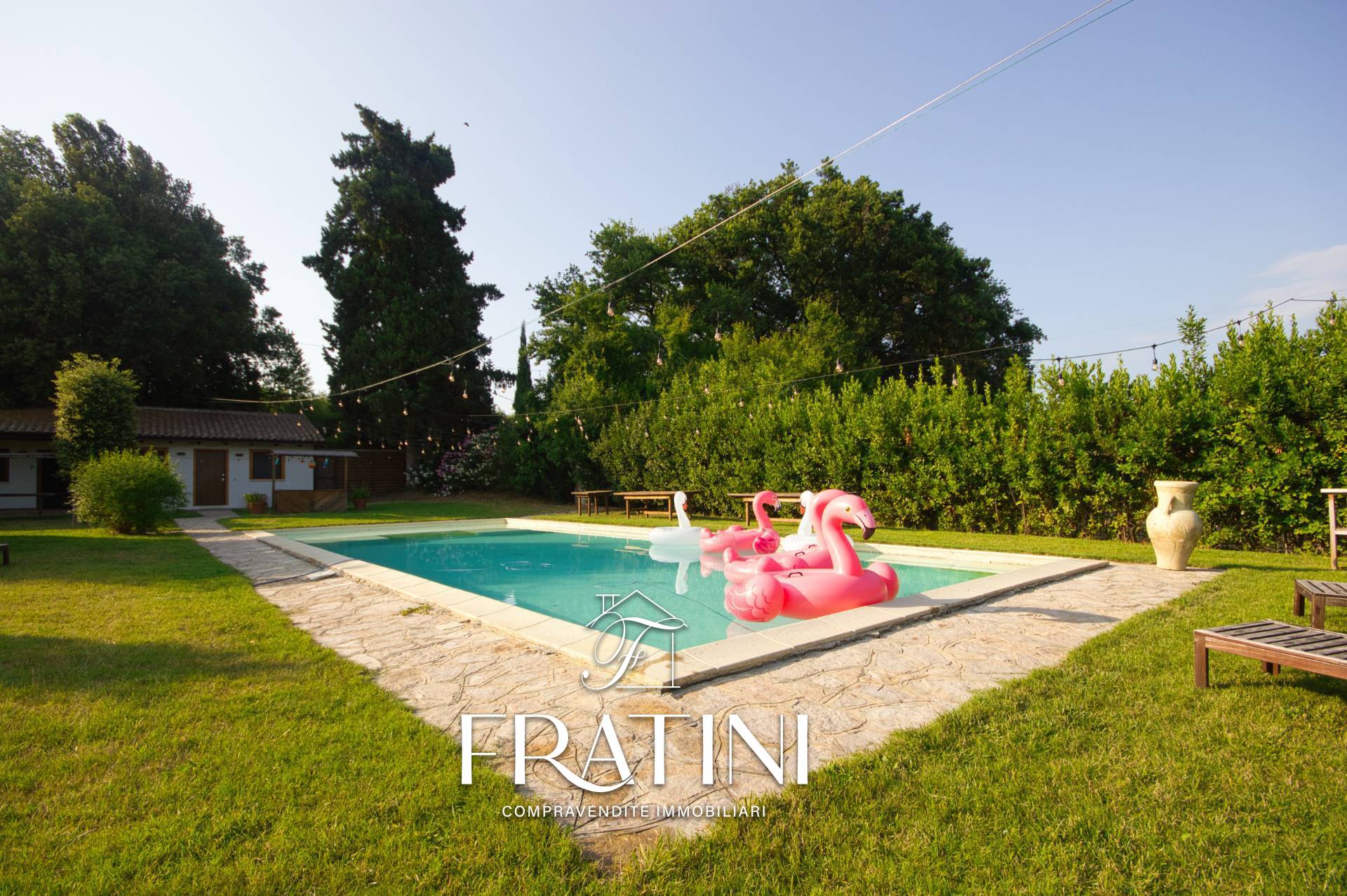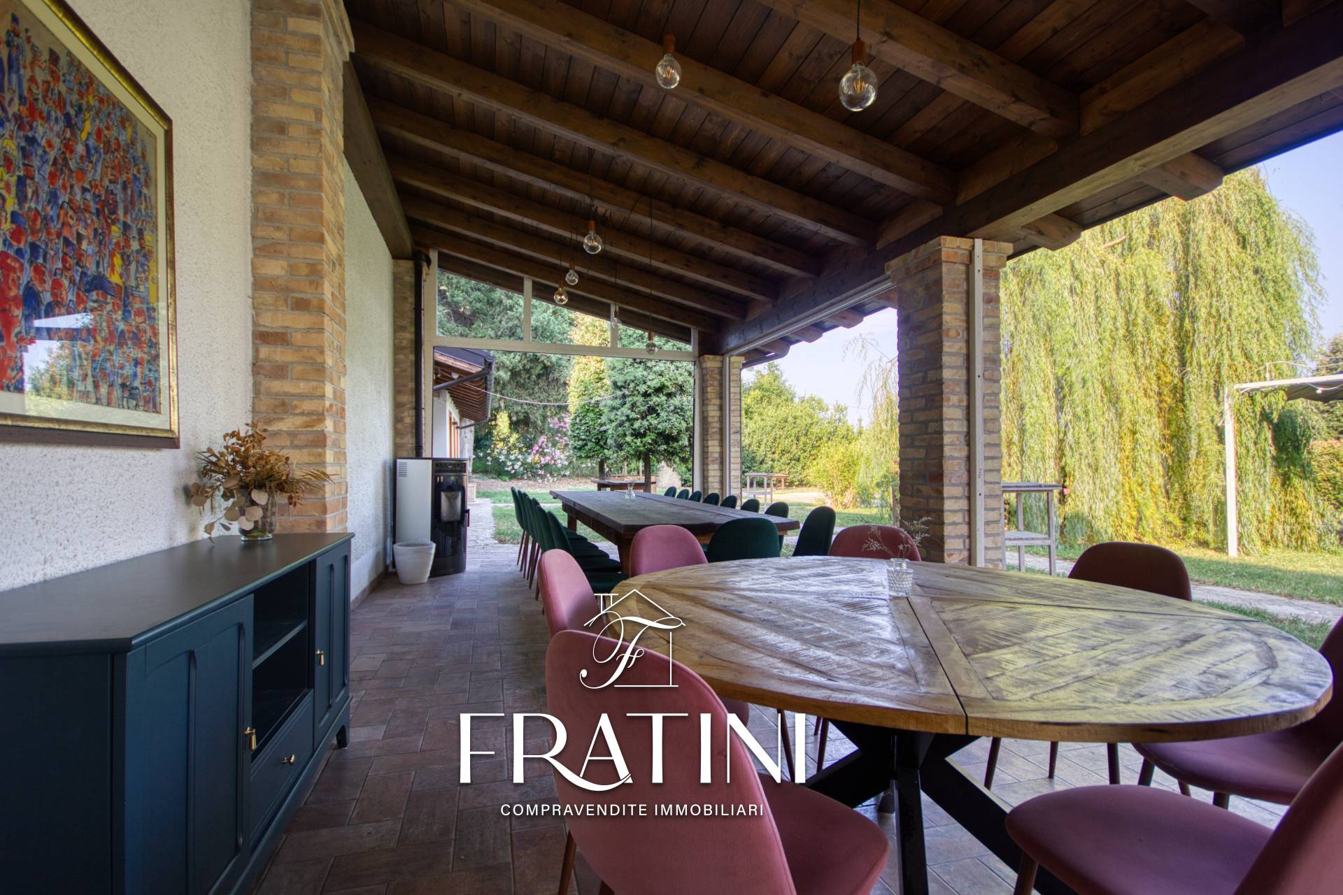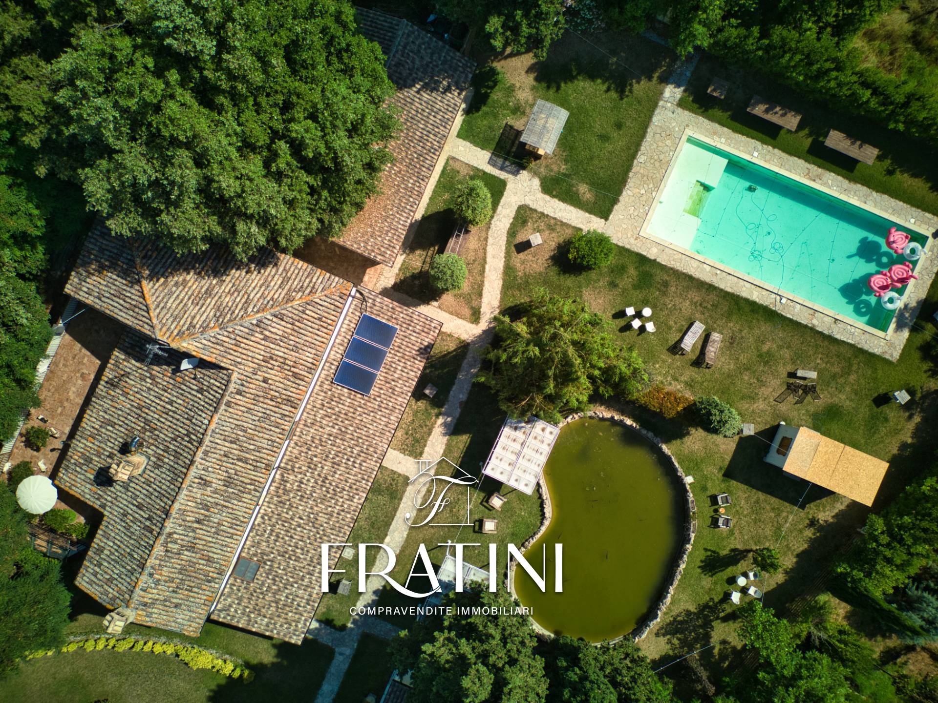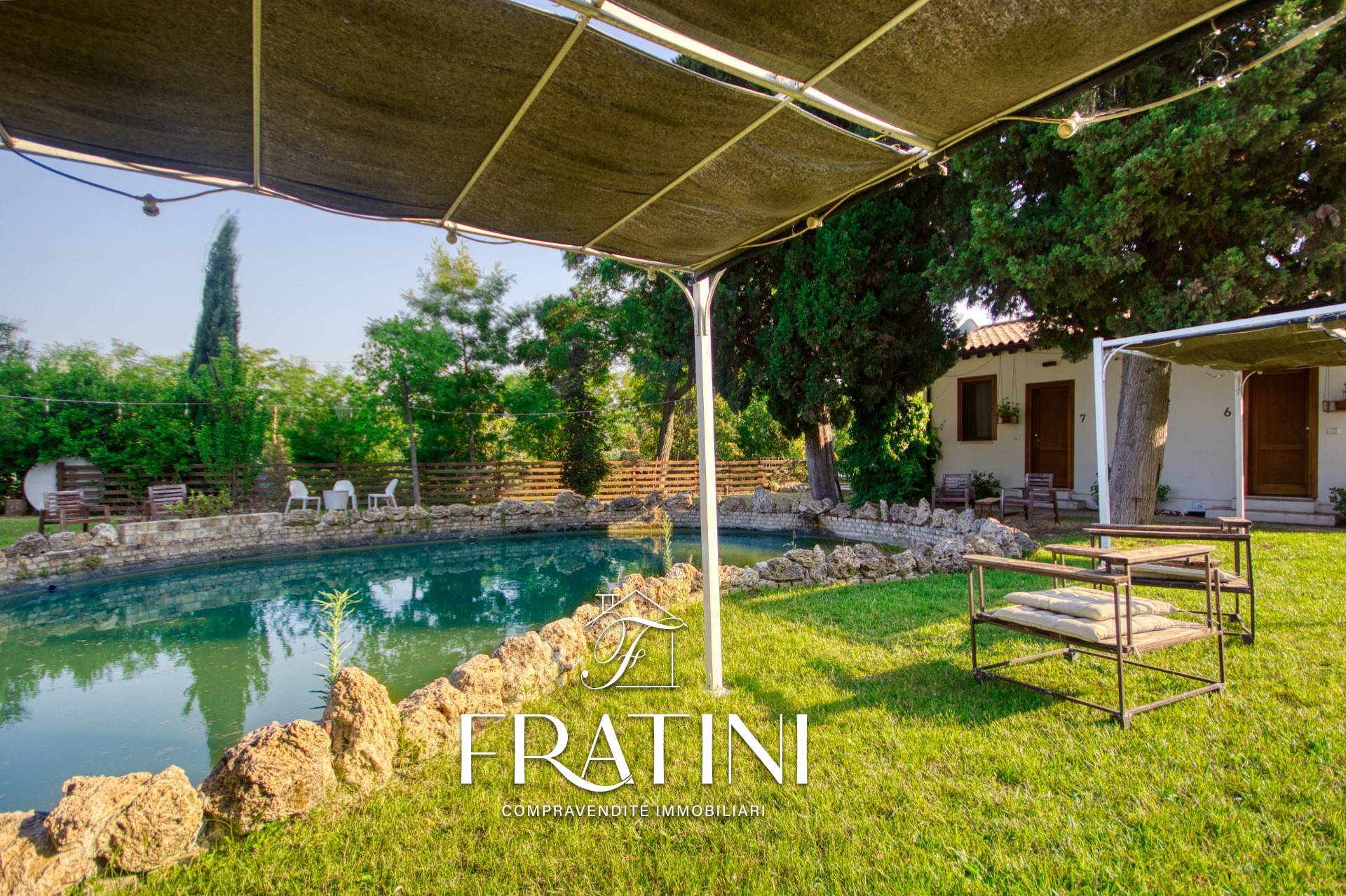La propriet inserita in un contesto di grande charme, circondata da ampi spazi verdi e da soluzioni abitative indipendenti, ed cos composta: Corpo principale su due livelli: Piano terra: accogliente sala da pranzo con ampia cucina industriale completamente attrezzata, servizi igienici per gli ospiti e una suggestiva cantina climatizzata, ideale per la conservazione dei vini. Primo piano: spaziosa zona soggiorno, ulteriore cucina, camere da letto e bagni di servizio.