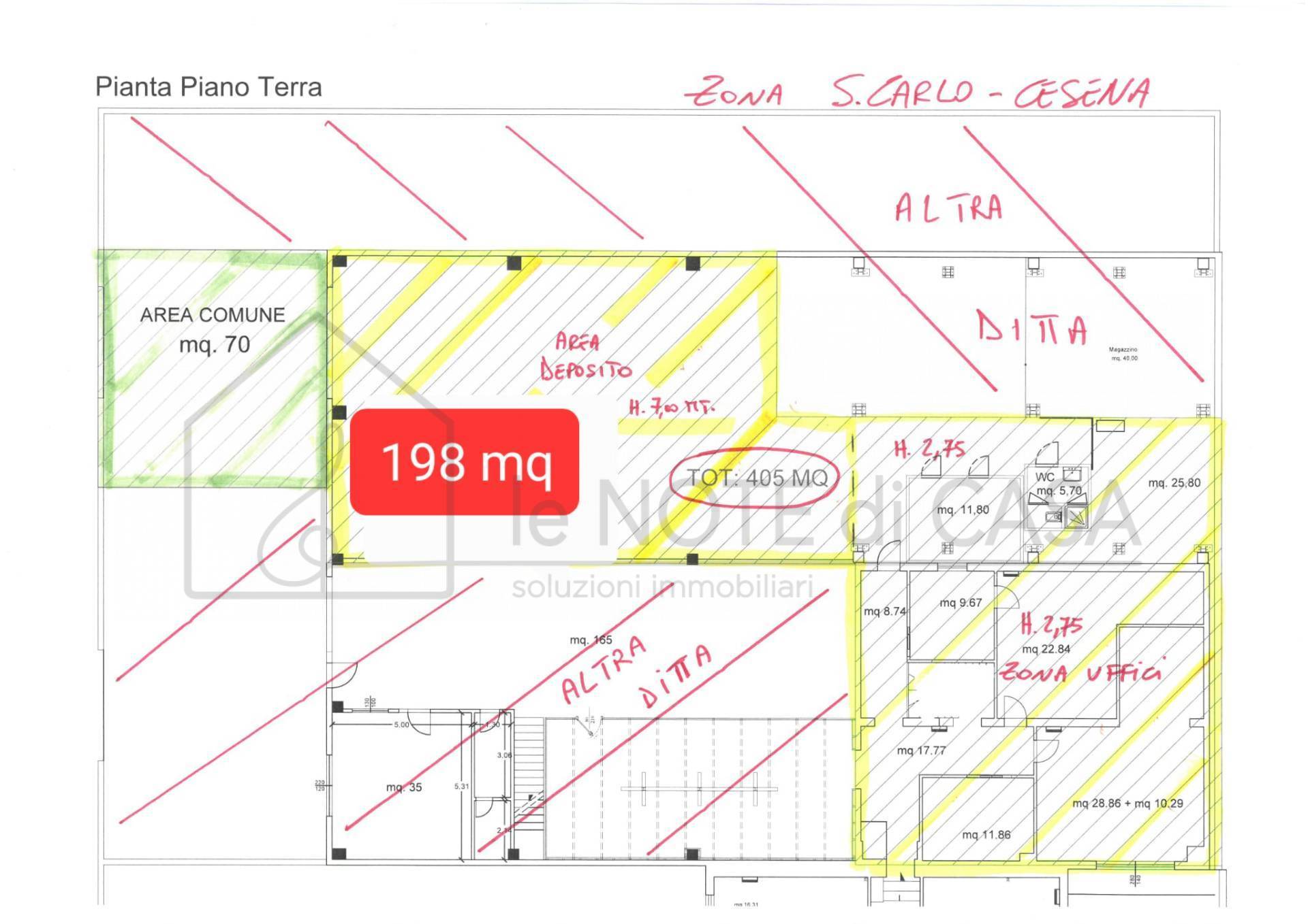 Il deposito proposto in affitto si trova nella zona di San Carlo, a Cesena caratterizzato da una superficie totale di 400 metri quadrati, di cui 200 mq. aventi altezza interna di 7 mt. e restante parte altezza 3 mt. con gi presenti vari locali da potersi adibire ad uffici e locali vari di servizio.
