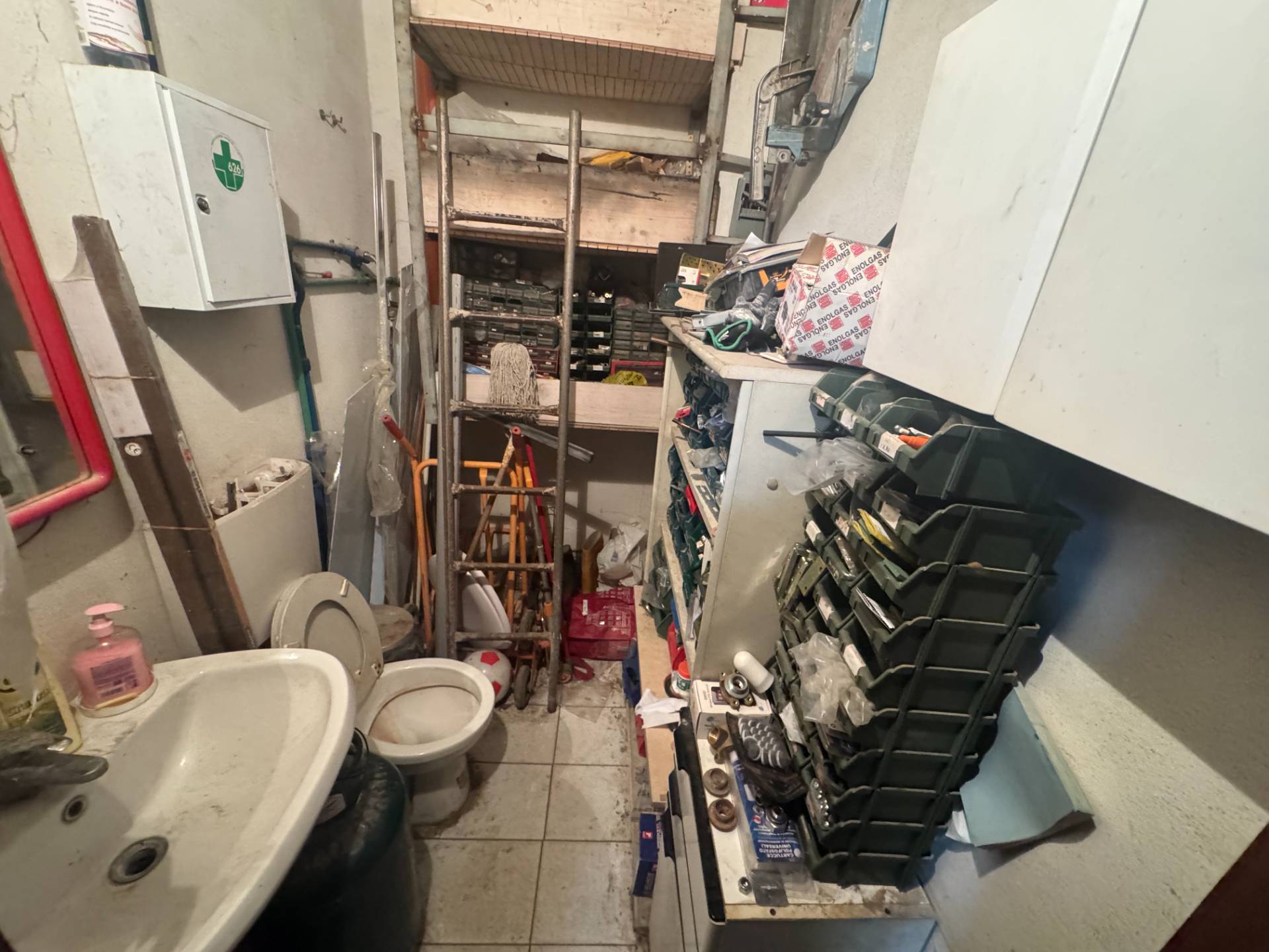 La soluzione dispone di doppio accesso: uno dedicato al carico / scarico della merce e l'altro esclusivamente pedonale su strada tramite una scala interna.