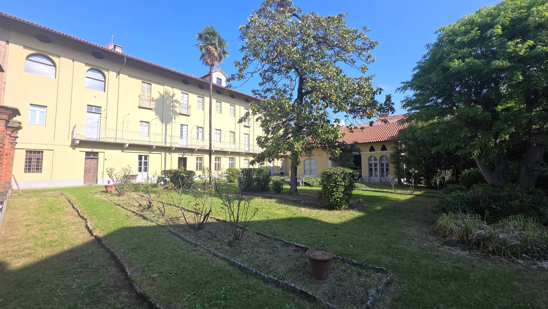 Laccesso avviene attraverso due cancelli, che conducono a un contesto di grande fascino e quiete: il giardino, di circa 760 mq, interamente racchiuso da mura perimetrali, elemento che richiama loriginaria funzione difensiva del sito e al contempo garantisce una dimensione di assoluta riservatezza.