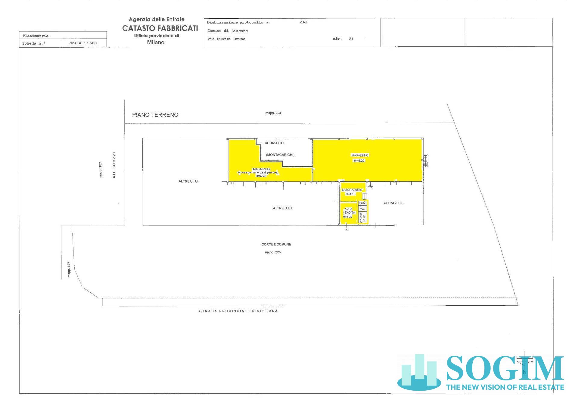 IMMOBILE COMMERCIALE IN LOCAZIONE A LISCATE Si tratta di 1.120 mq. di Cat. D8 - (160 mq di negozio + 960 mq. di laboratorio/magazzino), presenza di un bagno, ufficio, 3 ingressi carrai e 1 pedonale/carraio per il negozio, spazio pubblicitario, parcheggio privato, ingressi da due lati dello stabile, ecc. Le spese condominiali includono: gestione forniture comuni, servizio di vigilanza, antincendio, pulizie esterne, manutenzione spazi comuni, illuminazione, taglio erba, acqua potabile, ecc. Contatta l'inserzionista