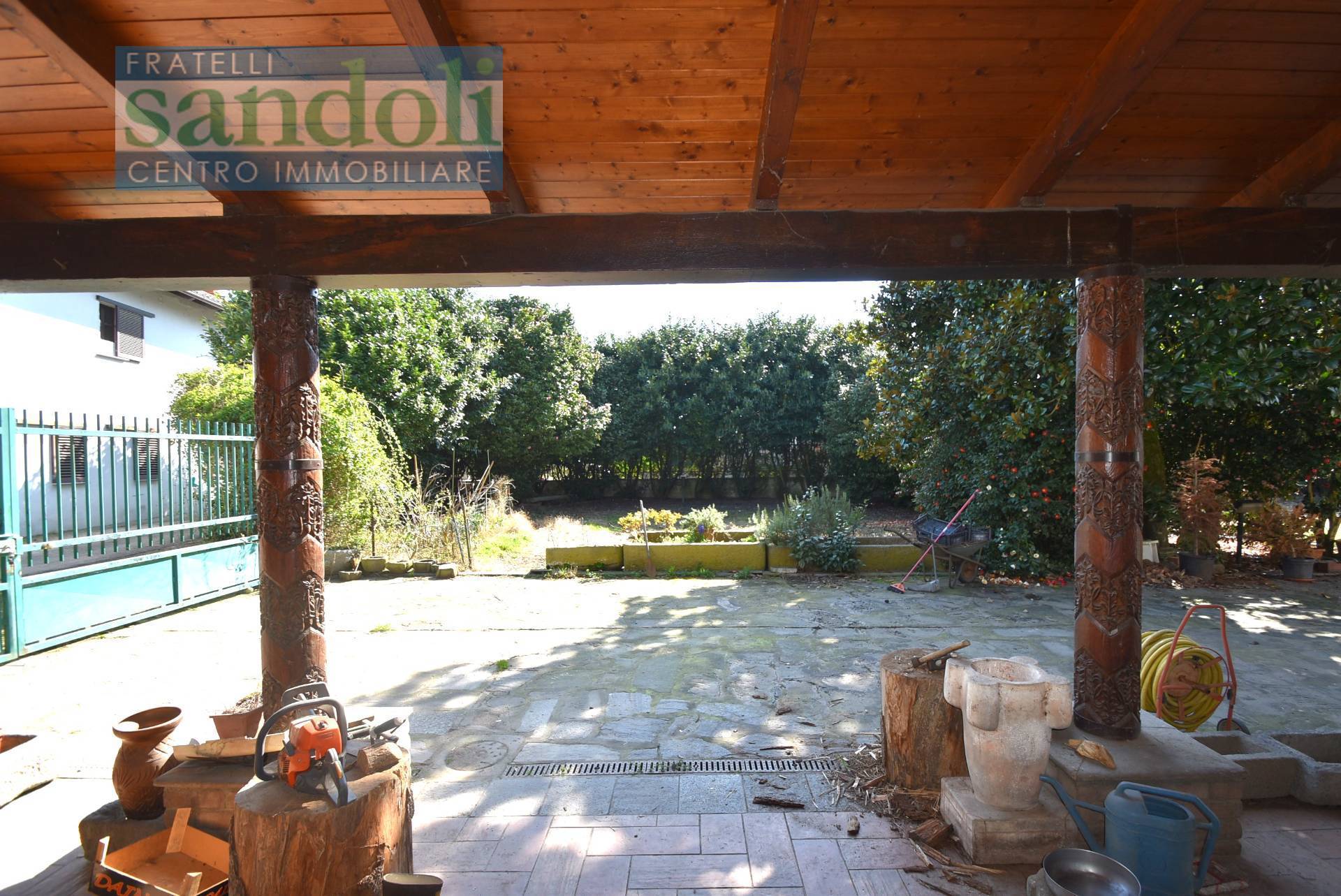 Disposto su due piani, al piano cortile dallo splendido porticato con colonne in legno finemente lavorate provenienti dal Portogallo si entra nell'ampio soggiorno con pavimento a sbalzo in mattonelle di cotto con caratteristico camino in muratura a mattoncini, sul lato del soggiorno vi poi la grande cucina con affaccio sul giardino e l'ampio studio anch'esso con un fantastico camino di spettacolari dimensioni ed antico pavimento.