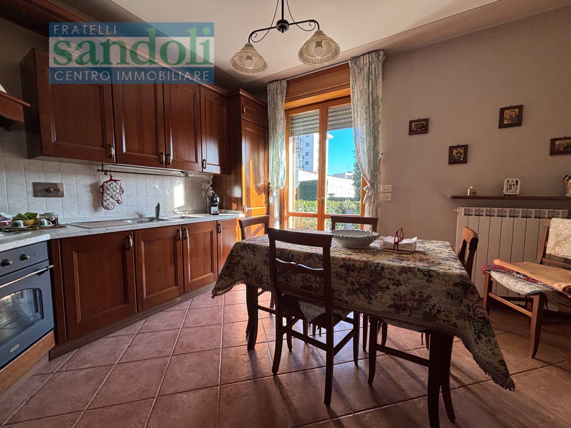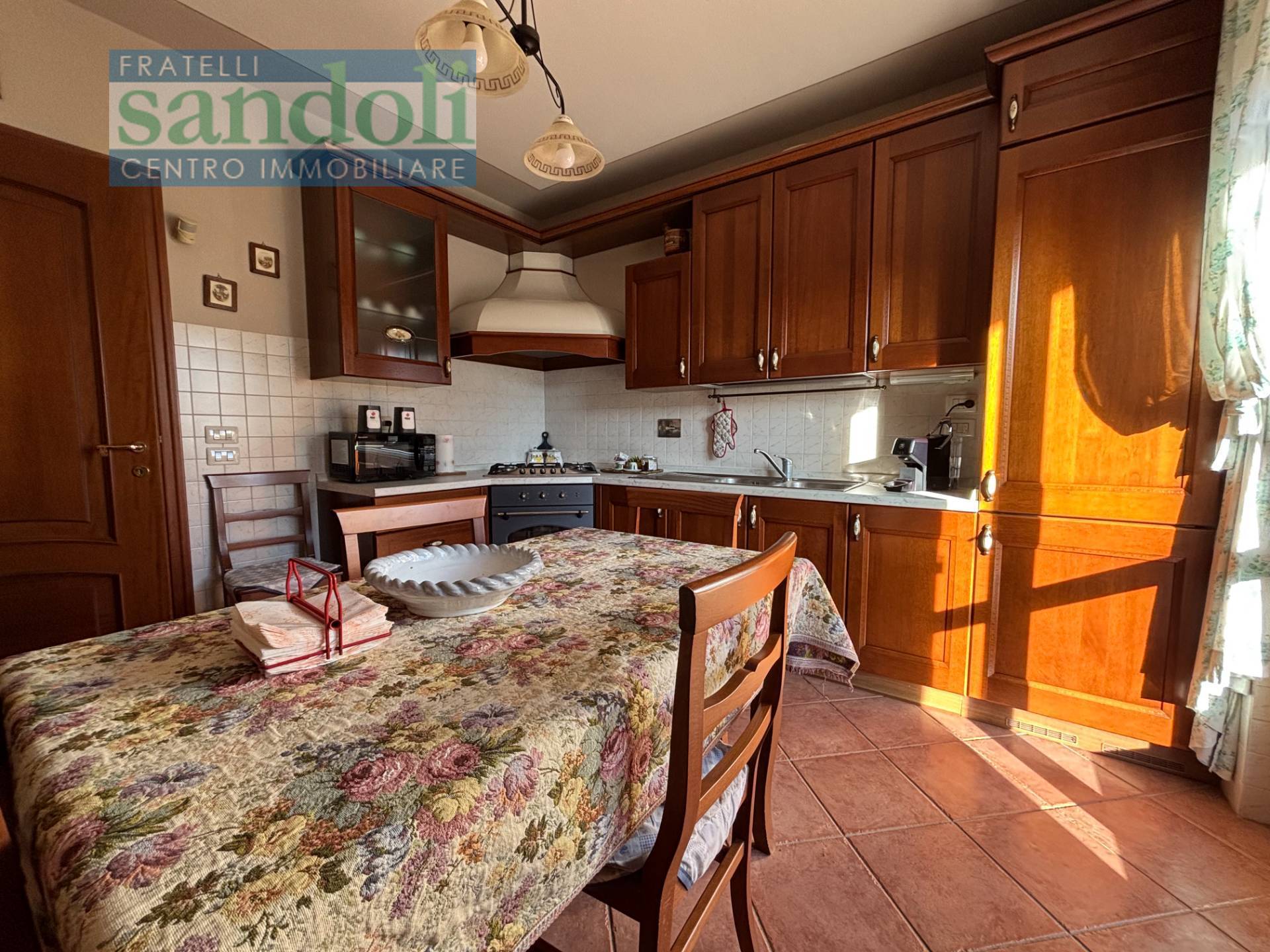 La cucina abitabile, spaziosa e funzionale, si affaccia su un terrazzo pavimentato che da sul giardino privato, ideale per godere di momenti di relax all'aperto.
