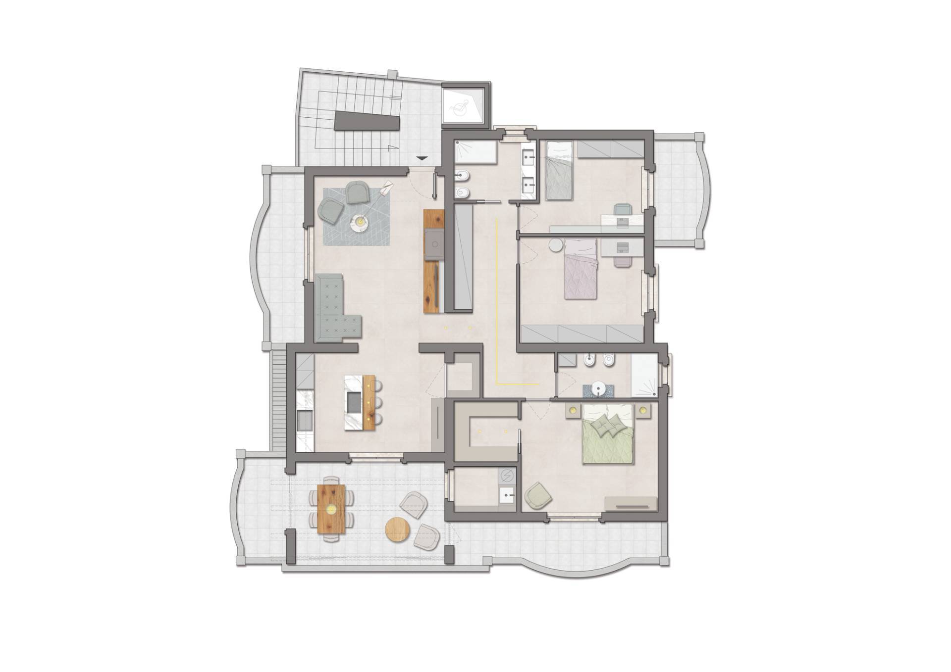 Le soluzioni abitative, attualmente in fase di ultimazione, offrono metrature che variano da 75 mq a 160 mq, oltre a balconi esterni che garantiscono ambienti luminosi e vivibili.