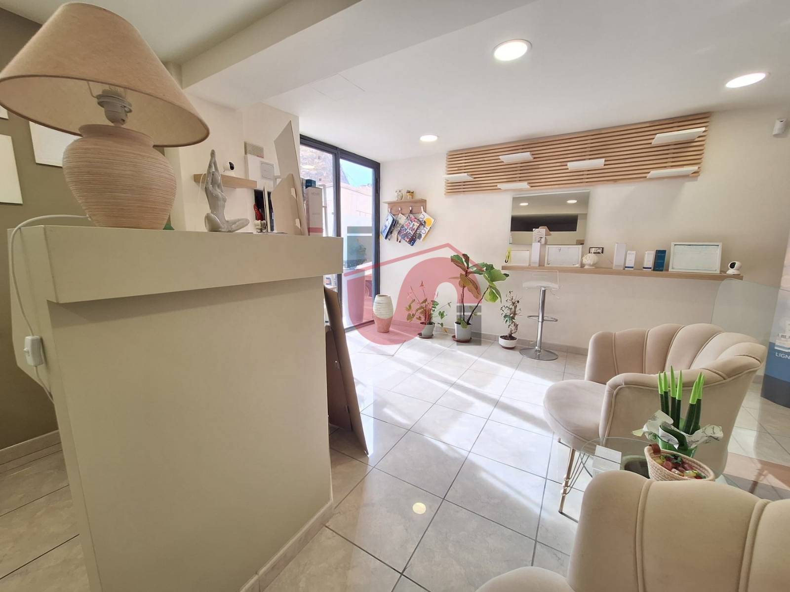 Attualmente suddiviso in zona reception, tre ambienti realizzati in cartongesso, servizio e deposito merci.