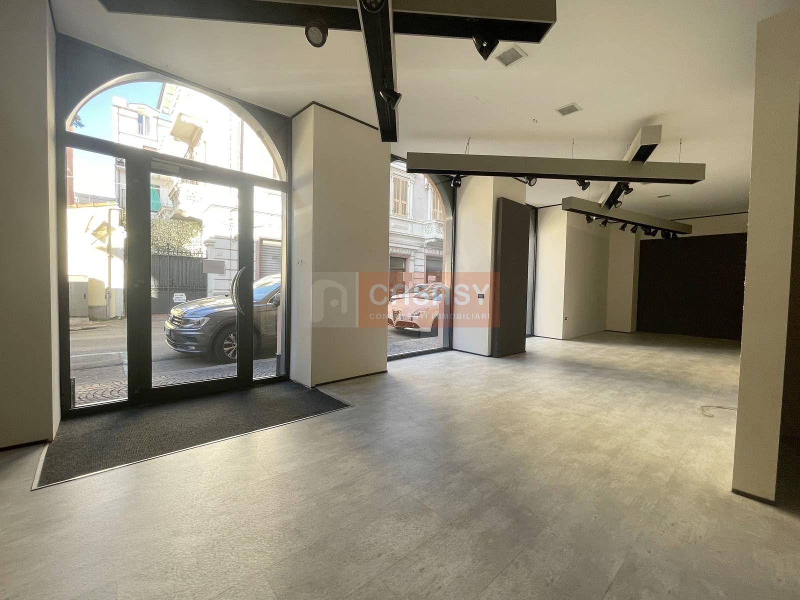 Lingresso del negozio affaccia sulla via principale e consente laccesso ad un grande locale destinato a vendita/esposizione con h. 3.30 e altre due grandi vetrate.