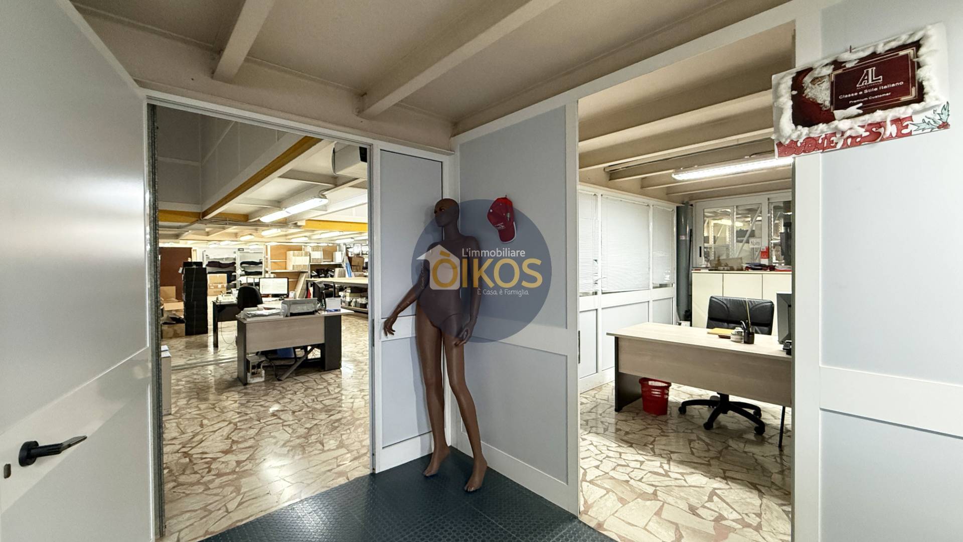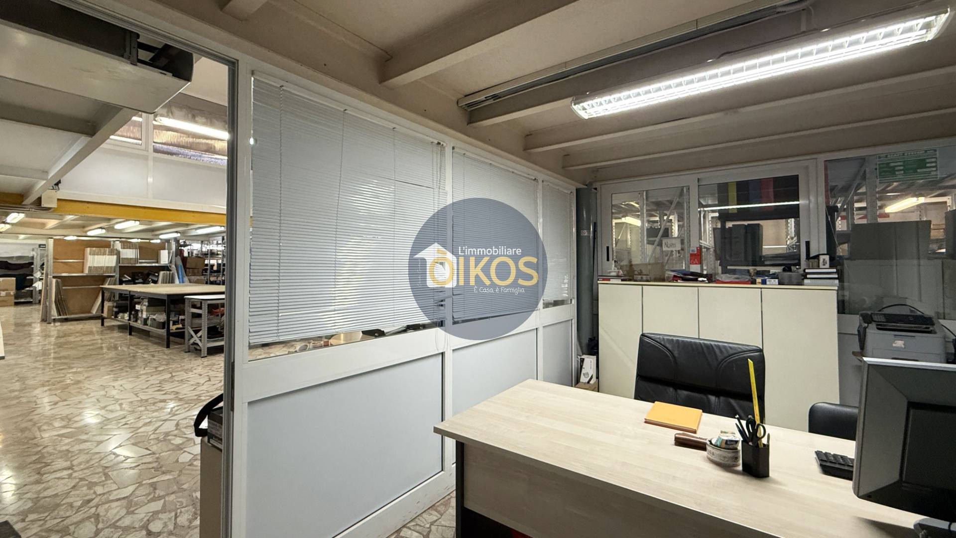 Dalla reception e dal pianerottolo con un secondo ingresso, si accede al grande locale principale, attualmente adibito ad area produttiva e di imballaggio: il vero cuore operativo dellimmobile.