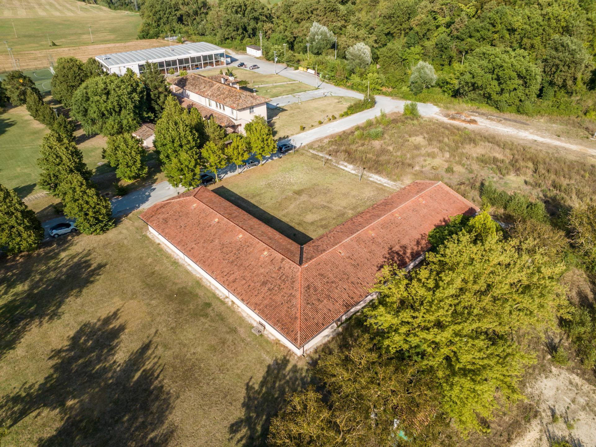 La tenuta comprende un ristorante su tre livelli, una palestra su due livelli, un box cavalli e campi sportivi all'aperto per la pratica di calcetto, recintati e provvisti di impianto di illuminazione, oltre ad una superficie edificabile di oltre mq.2000. Il ristorante, di complessivi mq.1.485, corredato di una dependance uso ufficio esterna, al piano terra comprende un portico con vetrate scorrevoli, un ingresso, una grande superficie di somministrazione, con tutte le autorizzazioni gi attive, 5 servizi igienici con antibagno, zona preparazione e cottura della pizza, cucina con zona lavaggio, area bar e un ufficio.