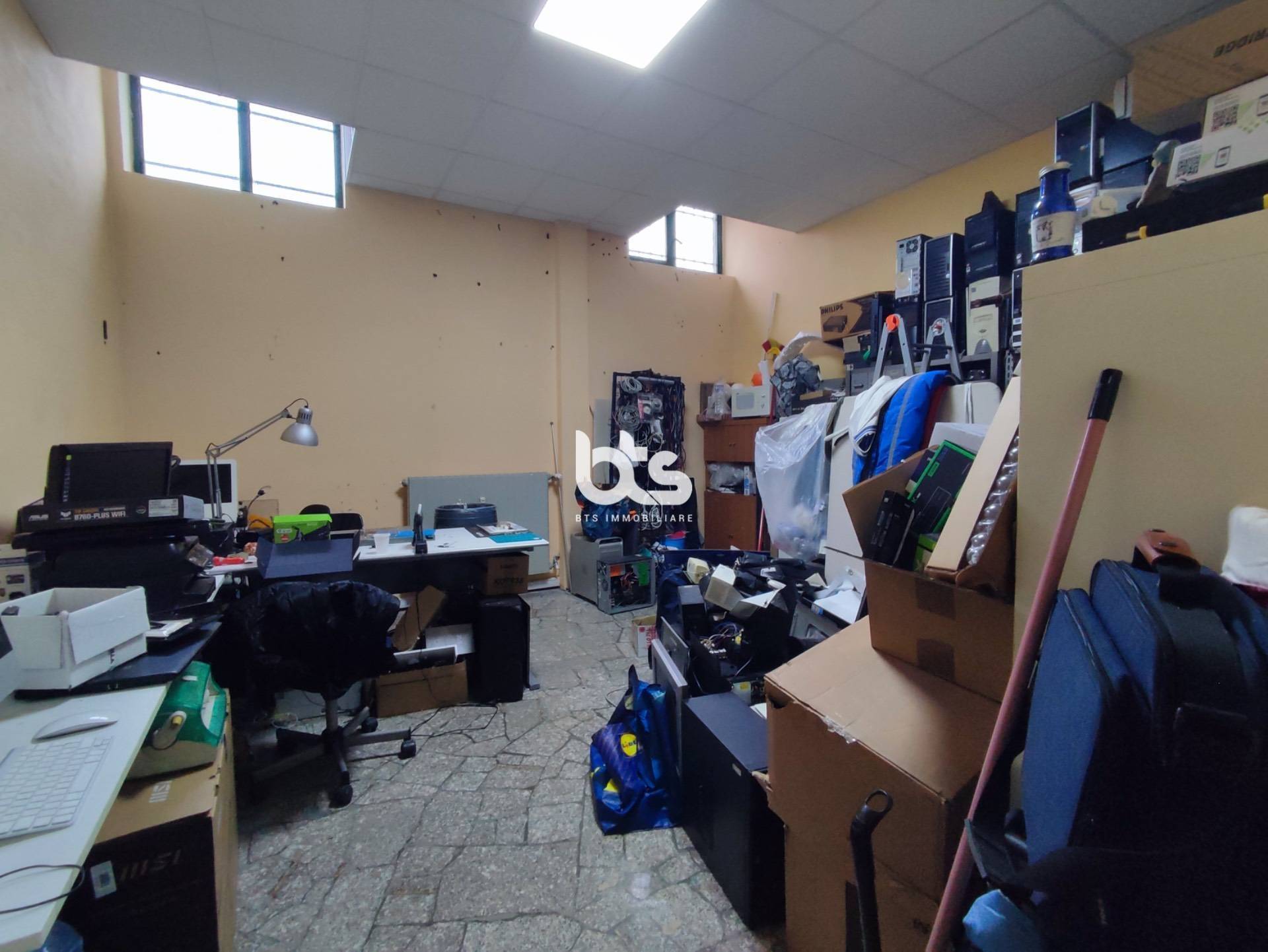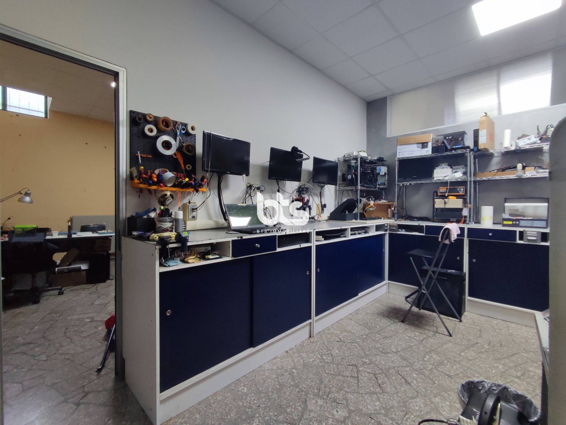 Superata la zona dell'ingresso arriviamo in un altro ambiente, ad oggi adibito alla sistemazione delle apparecchiature elettroniche; da qui possiamo proseguire verso una seconda stanza, verso il bagno di servizio oppure sul retro dell'immobile, ad oggi adibito a magazzino.