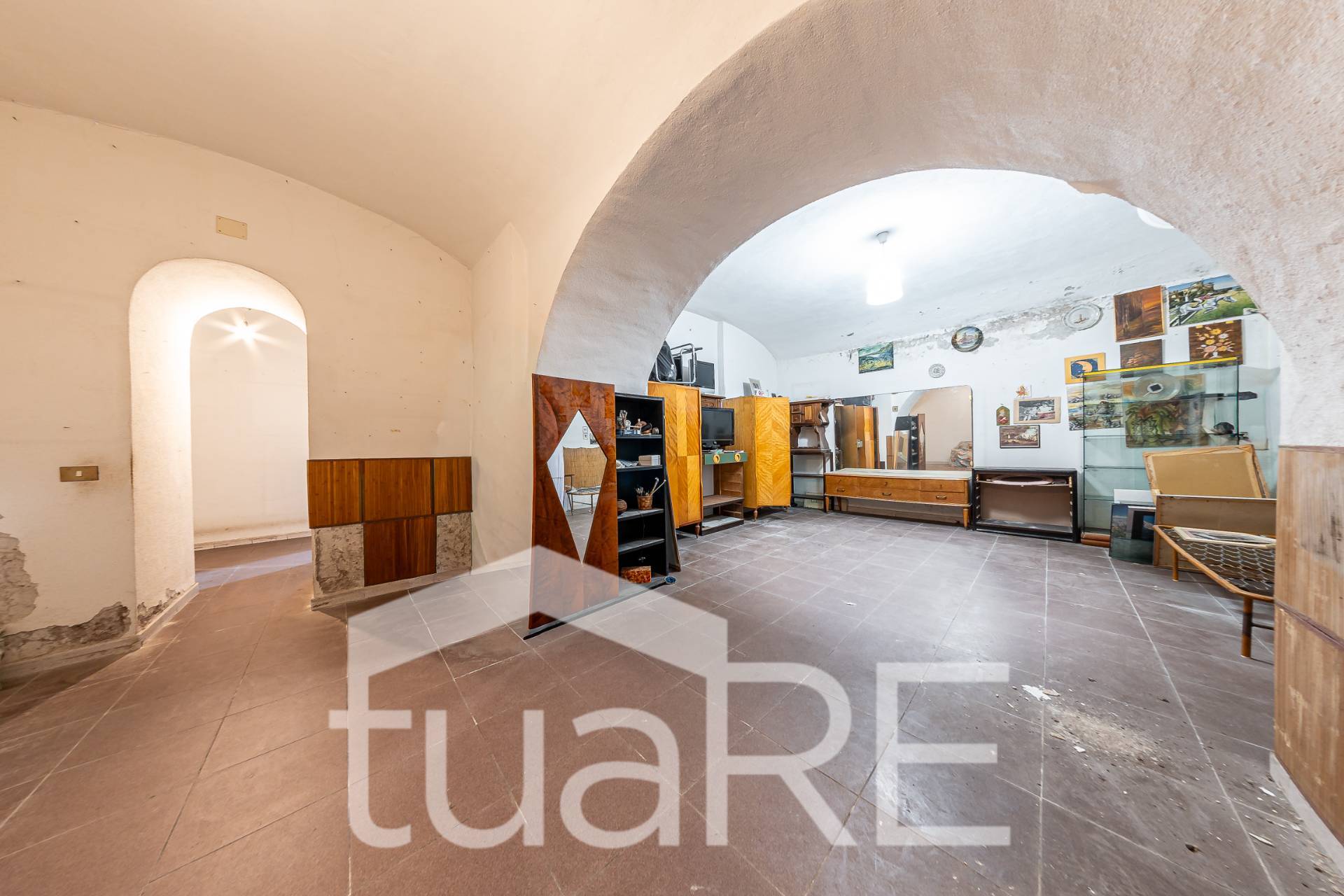 Dalla vetrina su strada si scende qualche gradino, poi il locale si compone di spazi molto ampi e molteplici stanze separate da tramezzature.