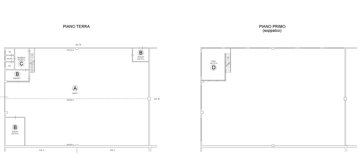 Il capannone strutturato su due livelli di cui il piano terra con deposito, 2 bagni e antibagno ed il primo piano con accesso tramite scala interna con area deposito ed ufficio.